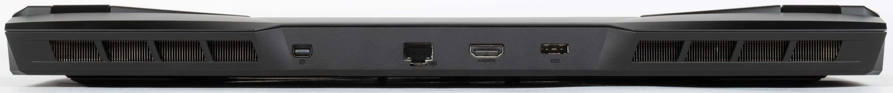 На задней панели заметны решетки отверстий, через которые наружу выбрасывается горячий воздух. Слева направо помещаются Mini-DisplayPort, RJ-45 Ethernet, HDMI и проприетарный разъем для подключения адаптера питания.