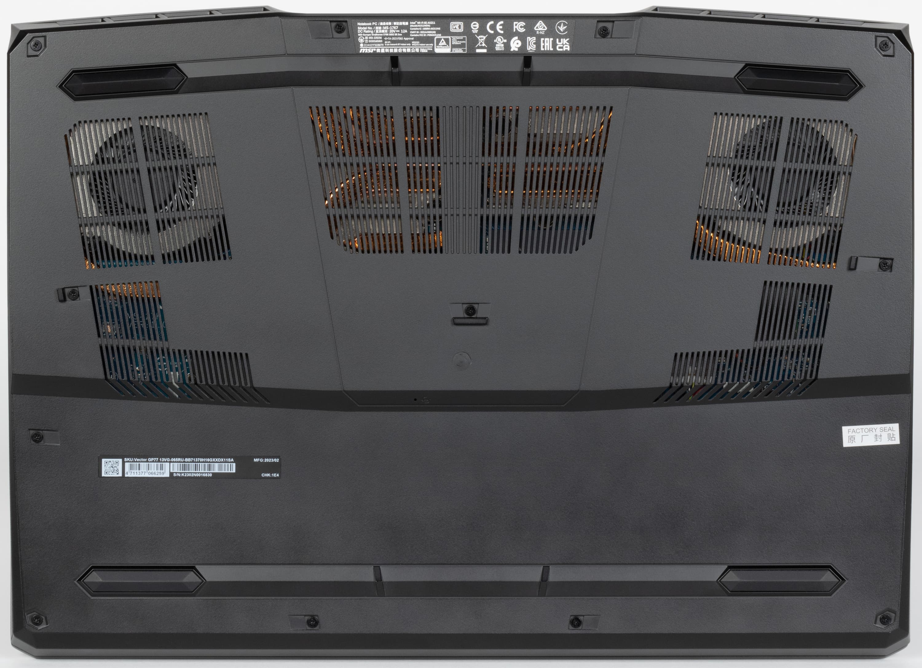 Петли за счет поднимающихся над поверхностью накладок массивные, но оценить их прочность сложно. Максимальный угол откидывания крышки составляет примерно 120°. В закрытом состоянии она удерживается без замков или магнитов, только за счет петель и доводчика, но держится при этом хорошо, поскольку усилие, необходимое для раскрытия, подобрано правильно. Петли довольно тугие, и ноутбук сложно открыть одной рукой, так как корпус при этом сдвигается и подпрыгивает на столе. Днище имеет хитрый рельеф поверхности, позволяющий выиграть изнутри в доступном объеме, как раз над системой охлаждения.
