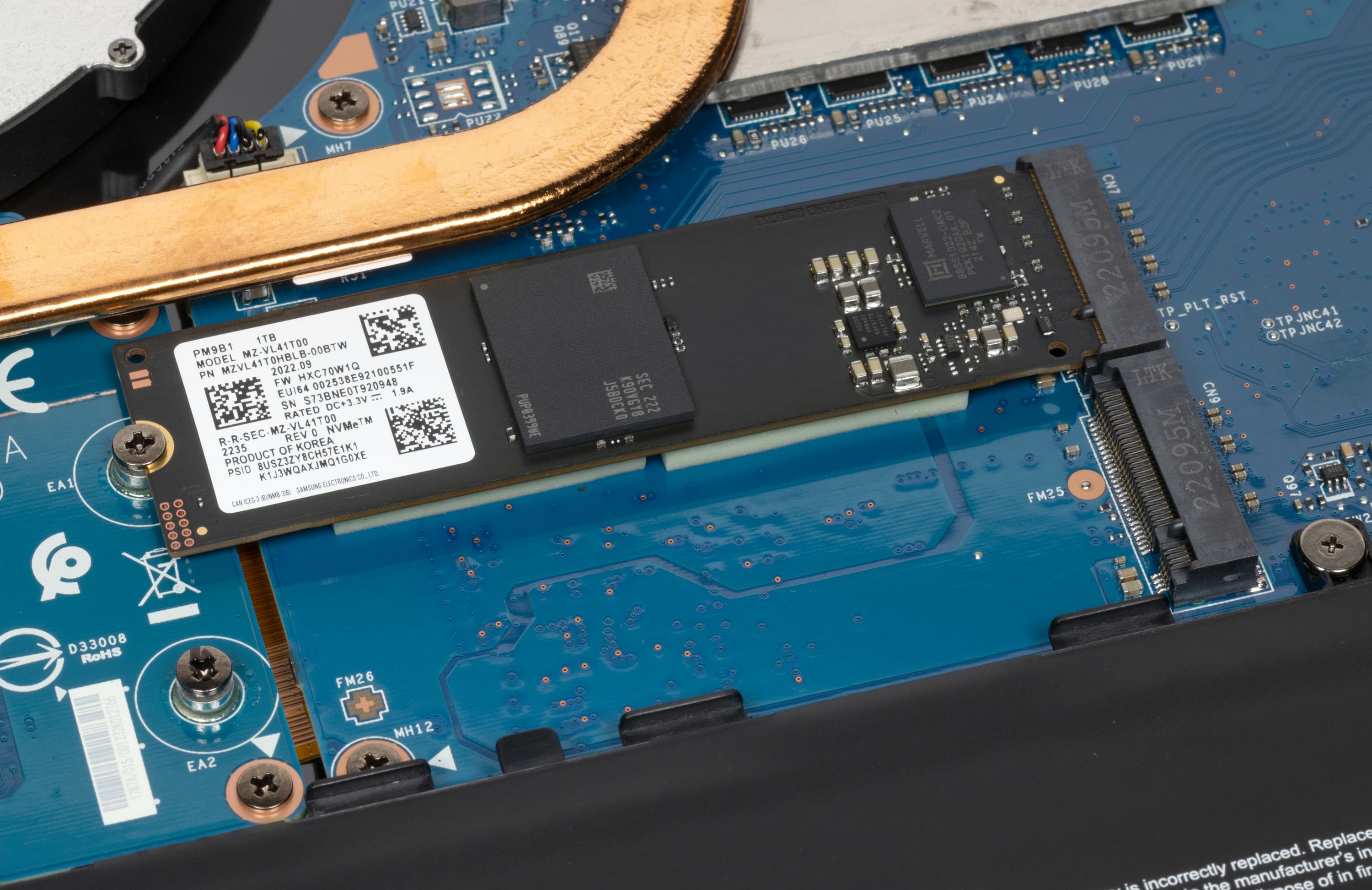 Твердотельный накопитель в слоте M.2, напротив, один. Это Samsung PM9B1 (MZAL41T0HBLB) с интерфейсом PCIe 4.0 x4.