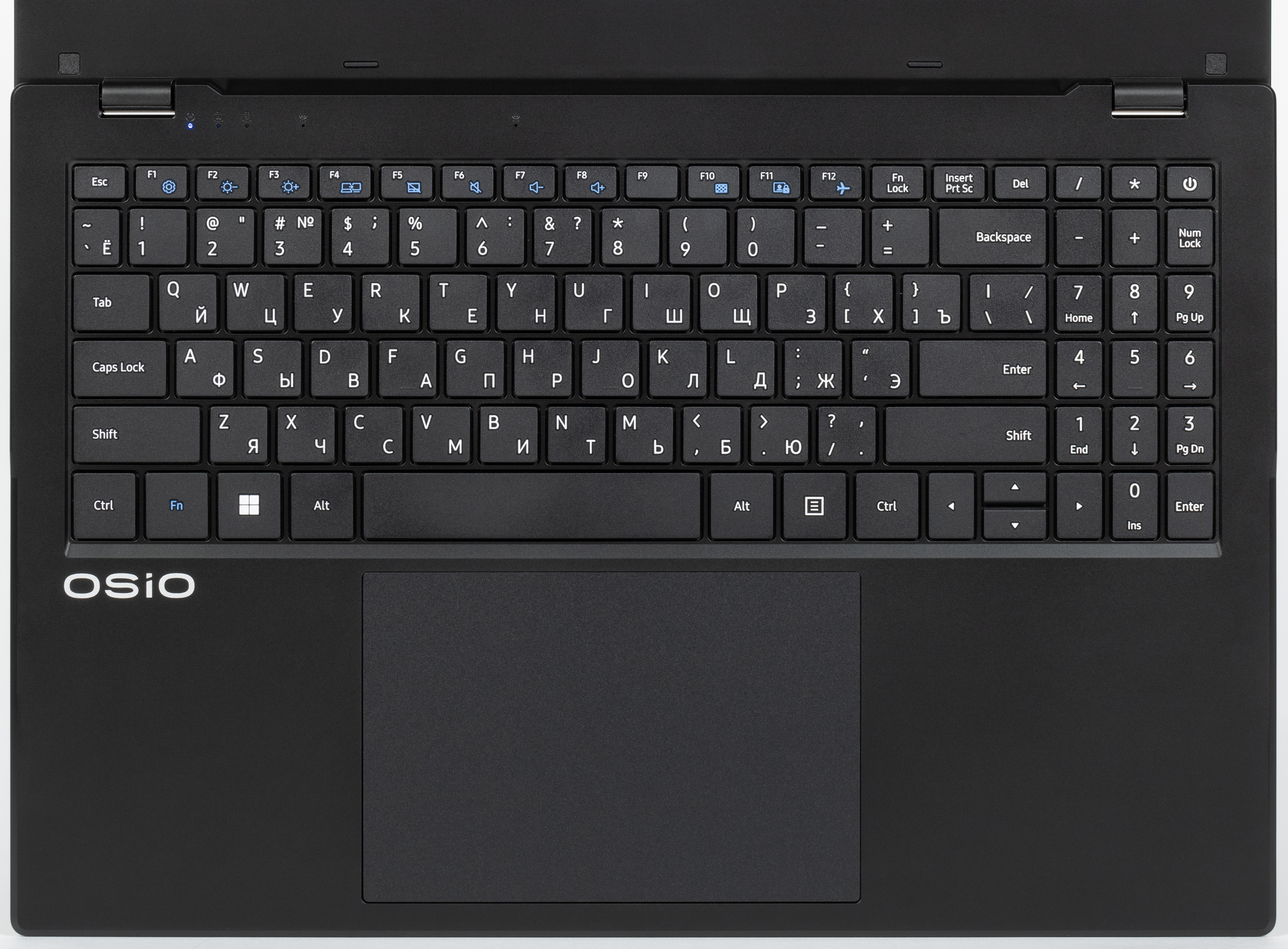 За клавиатурой слева находятся крошечные светодиодные индикаторы включения и режимов Caps Lock, Num Lock. Там же, но чуть правее, расположены отверстия микрофонов.