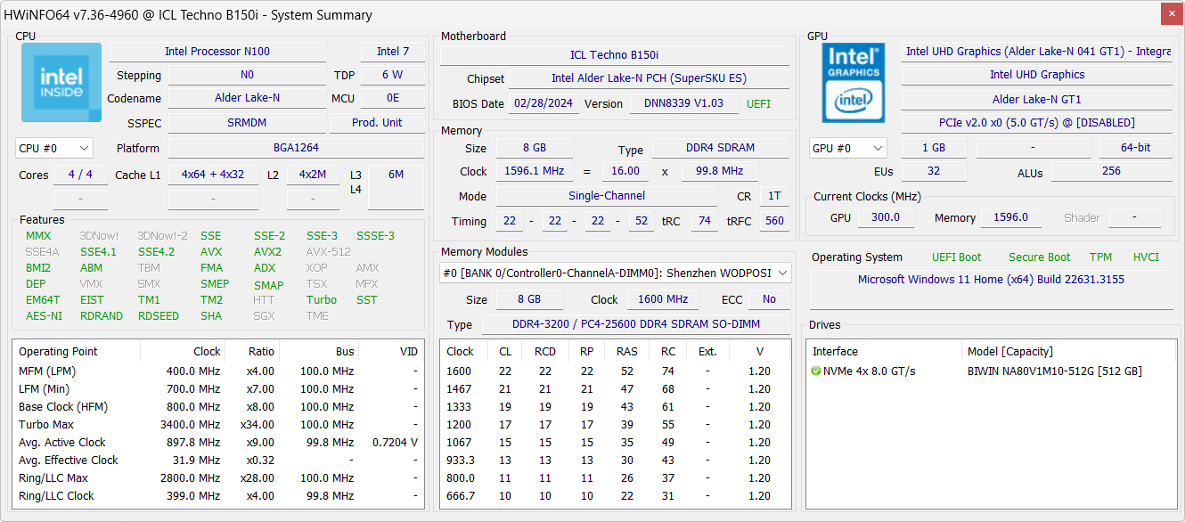 | Оперативная память | 8 ГБ DDR4-3200 (1 × Wodposit WPBH32D408SWD-8G в слоте SO-DIMM) свободного слота для второго модуля нет | |