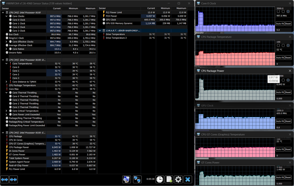 В ноутбуке установлен процессор Intel N100 (кодовое наименование Alder Lake-N, выпускается с начала 2023 года). У него четыре однопоточных энергоэффективных ядра, которые могут работать на частотах до 3,4 ГГц.