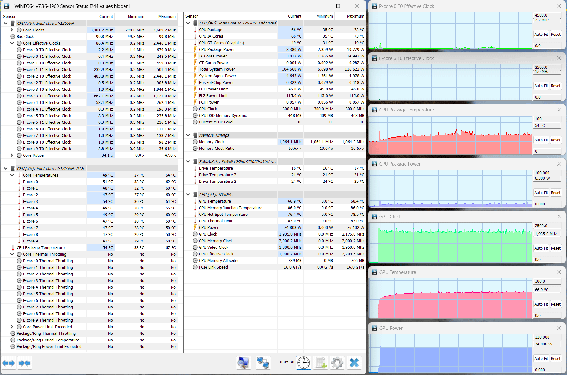Для игр и приложений, способных задействовать GPU, установлена дискретная видеокарта Nvidia GeForce RTX 4060 Laptop, для которой ее производитель заявляет частоту до 2370 МГц и потребление до 115 Вт, но в конкретной модели ноутбука могут быть несколько иные значения — в спецификации исследуемого аппарата TGP обозначен на уровне 100 Вт, максимальная частота — 2175 МГц. Реально в соответствующих тестах мы видели частоту до 2,45-2,46 ГГц (правда, кратковременно) и потребление до 100 Вт.