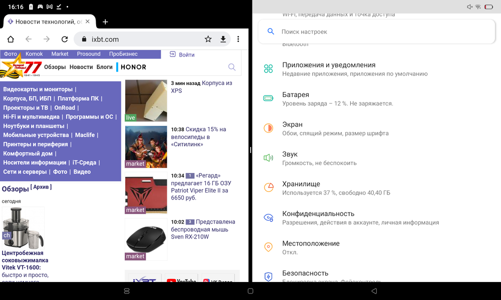 Из интересных особенностей оболочки отметим возможность разделить экран под два приложения. Причем соотношение площади двух окон может быть 1:1, а может — 1:2 или 2:1. Все это легко регулируется.