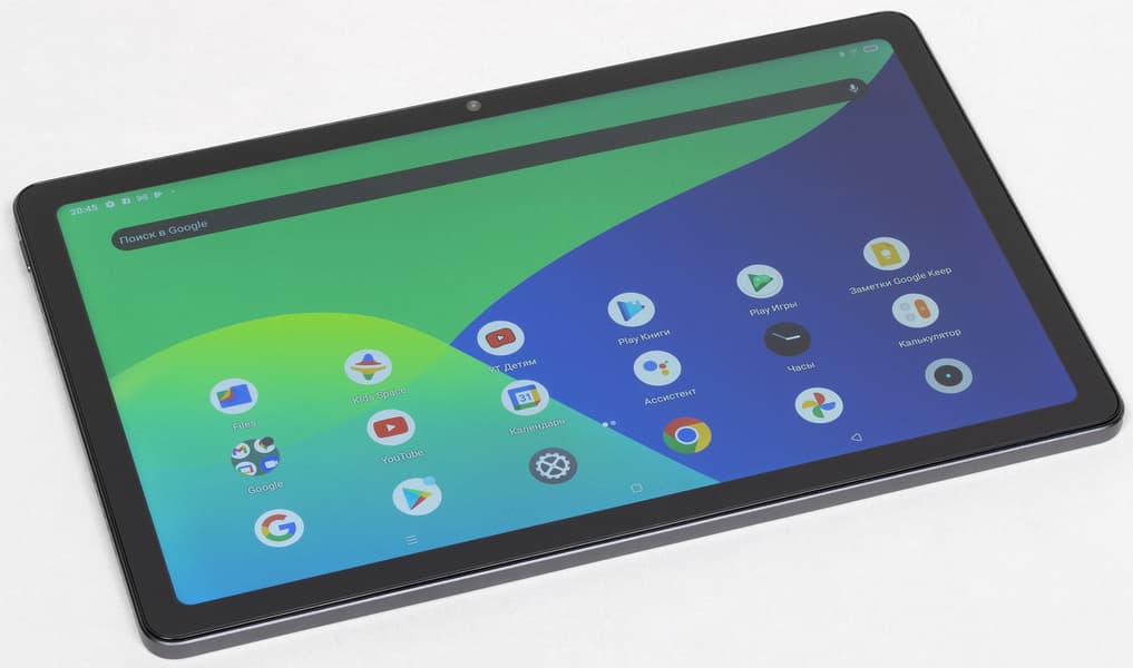 Дизайн самого планшета по нынешним меркам стандартный: фронтальная поверхность — почти сплошной экран, окантованный довольно узкой, одинаковой по ширине черной рамкой.