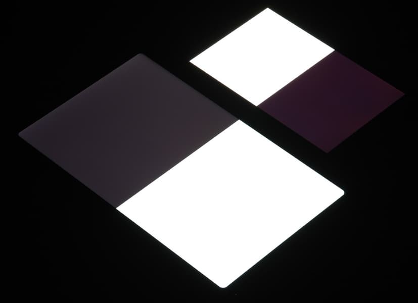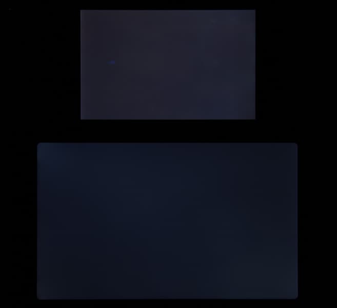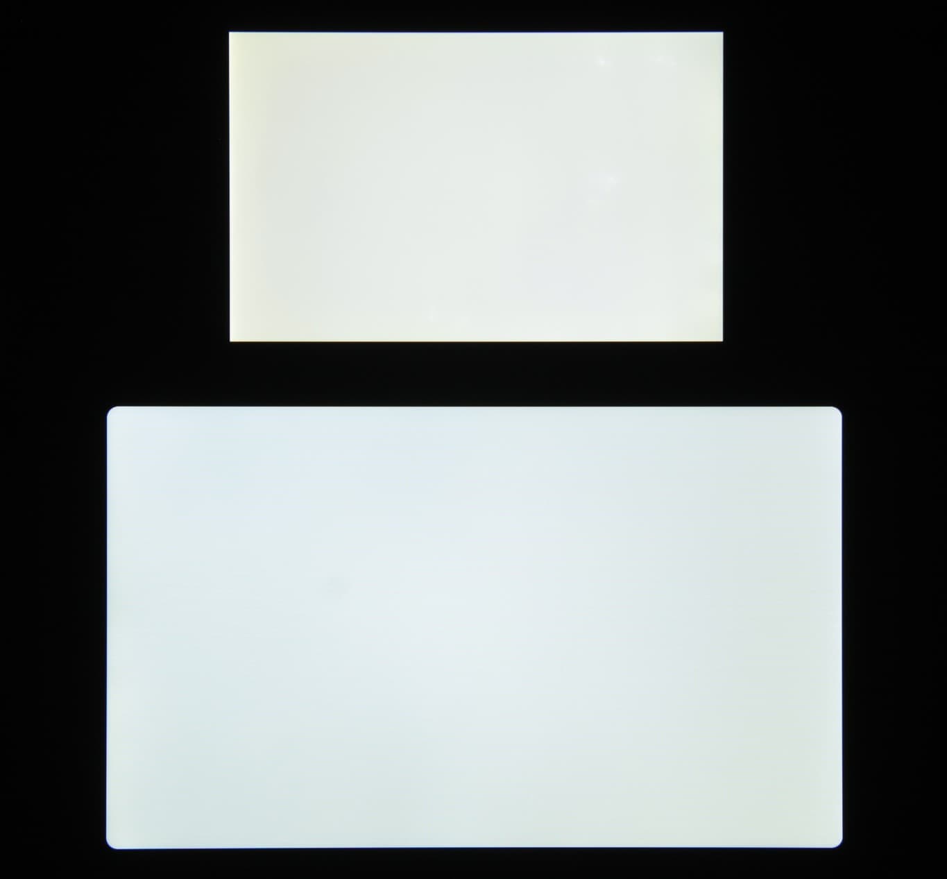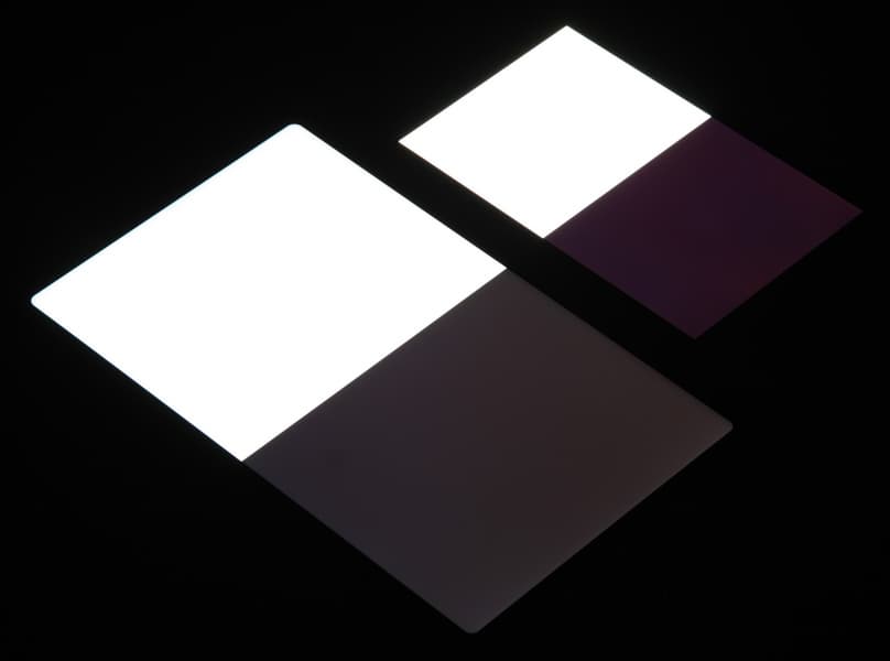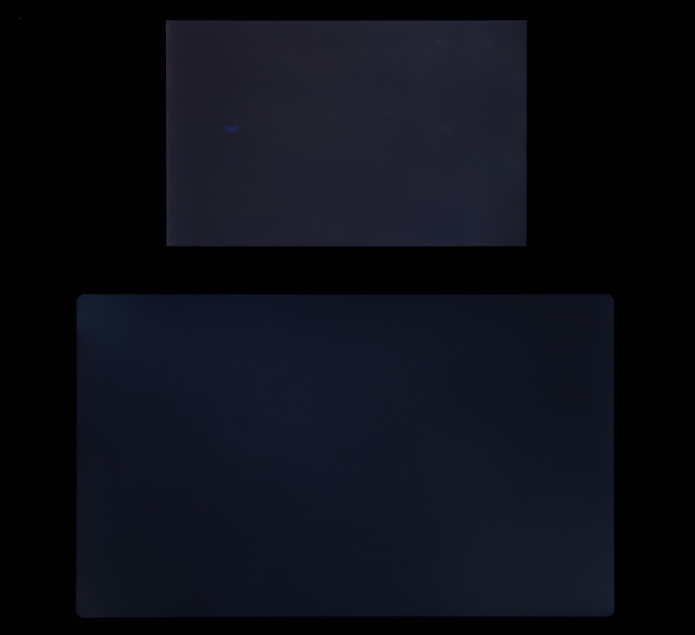 Яркость под углом у экранов уменьшилась (как минимум в 5 раз, исходя из разницы в выдержке), но у Realme Pad снижение яркости больше. Черное поле при отклонении по диагонали сильно высветляется и приобретает красноватый или желтоватый оттенок. Фотографии ниже это демонстрируют (яркость белых участков в перпендикулярном плоскости экранов направлении одинаковая!):