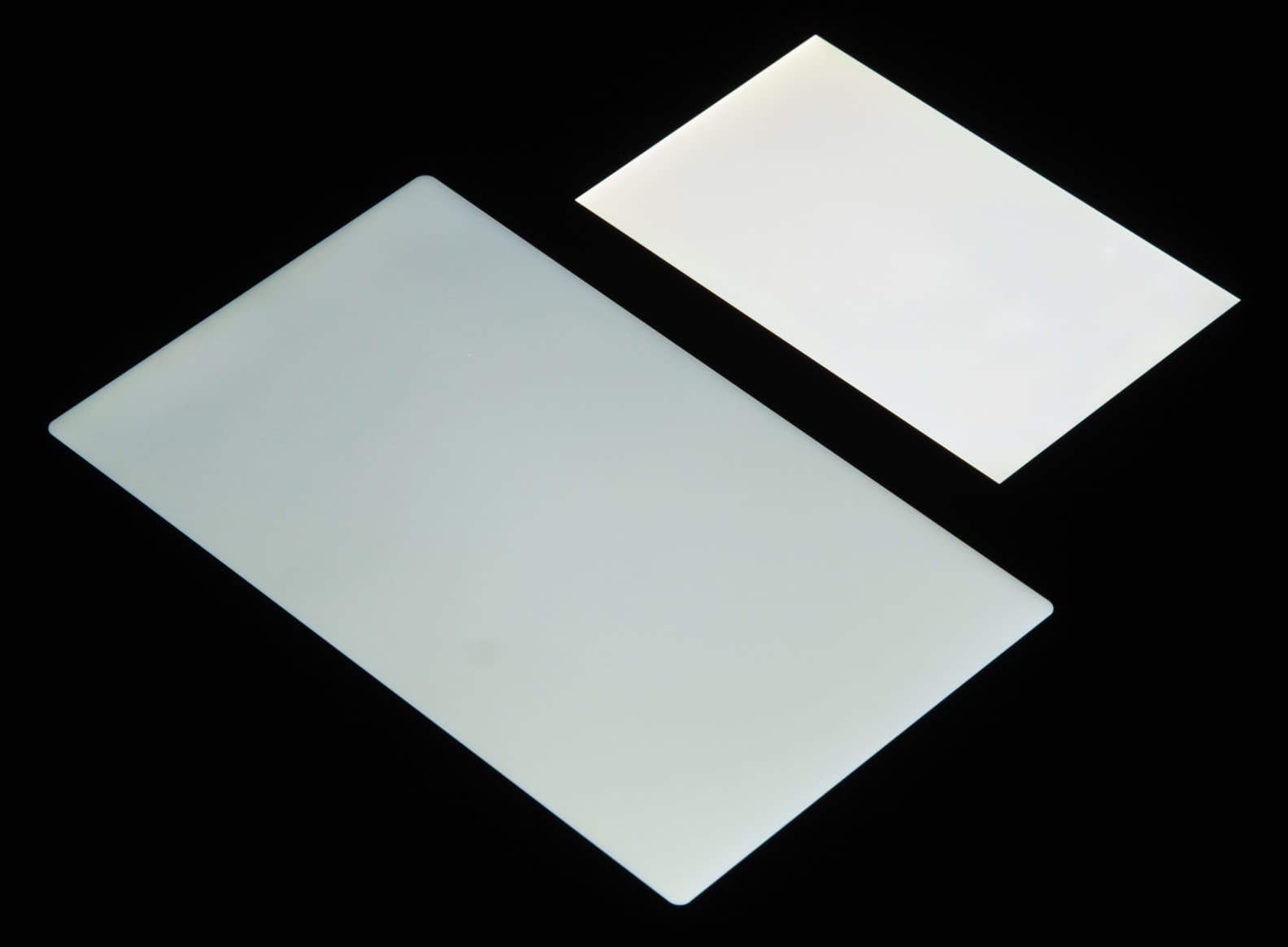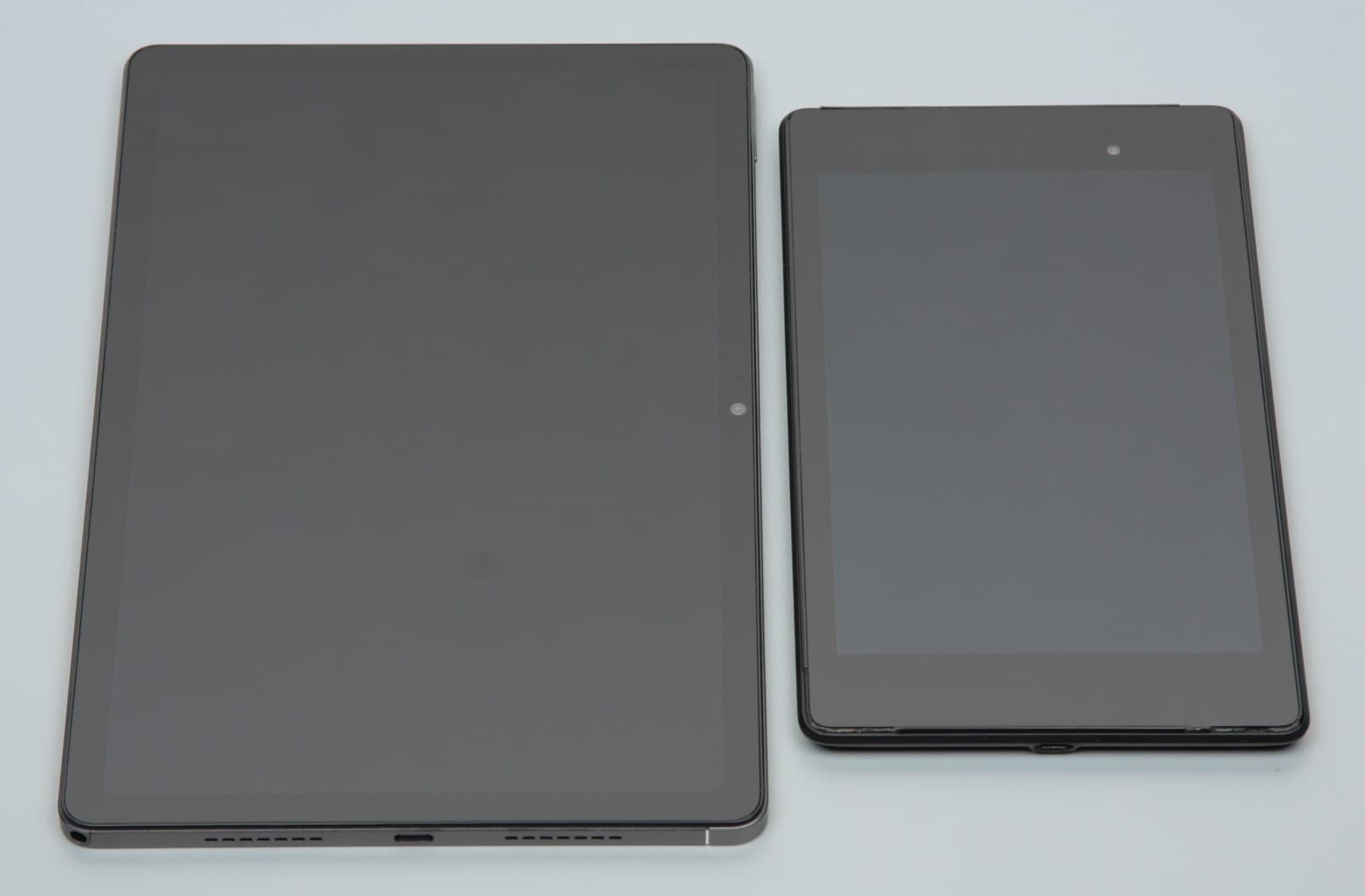 Лицевая поверхность экрана выполнена в виде стеклянной пластины с зеркально-гладкой поверхностью, устойчивой к появлению царапин. Судя по отражению объектов, антибликовые свойства экрана лучше, чем у экрана Google Nexus 7 (2013) (далее просто Nexus 7). Для наглядности приведем фотографию, на которой в выключенных экранах отражается белая поверхность (справа — Nexus 7, слева — Realme Pad, далее их можно различать по размеру):