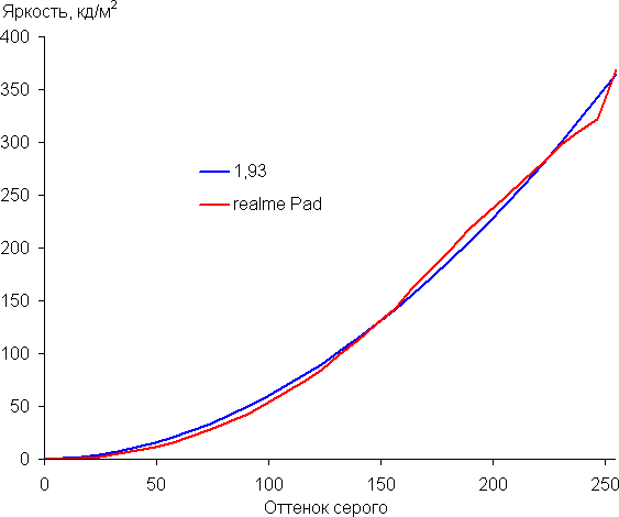 Контрастность (примерно в центре экрана) высокая — порядка 1450:1. Время отклика при переходе черный-белый-черный равно 21 мс (10 мс вкл. + 11 мс выкл.). Переход между полутонами серого 25% и 75% (по численному значению цвета) и обратно в сумме занимает 34 мс. Построенная по 32 точкам с равным интервалом по численному значению оттенка серого гамма-кривая не выявила завала ни в светах, ни в тенях. Показатель аппроксимирующей степенной функции равен 1,93, что ниже стандартного значения 2,2. При этом реальная гамма-кривая существенно отклоняется от степенной зависимости: