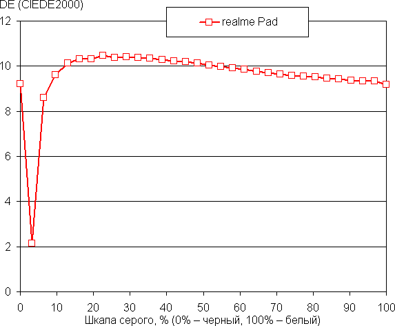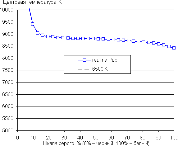 Баланс оттенков на шкале серого средний, так как цветовая температура существенно выше стандартных 6500 К и отклонение от спектра абсолютно черного тела (ΔE) на шкале серого местами выше 10, что даже для потребительского устройства считается не очень хорошим показателем. Однако при этом цветовая температура и ΔE мало изменяются от оттенка к оттенку — это положительно сказывается на визуальной оценке цветового баланса. (Самые темные области шкалы серого можно не учитывать, так как там баланс цветов не имеет большого значения, да и погрешность измерений цветовых характеристик на низкой яркости большая.)