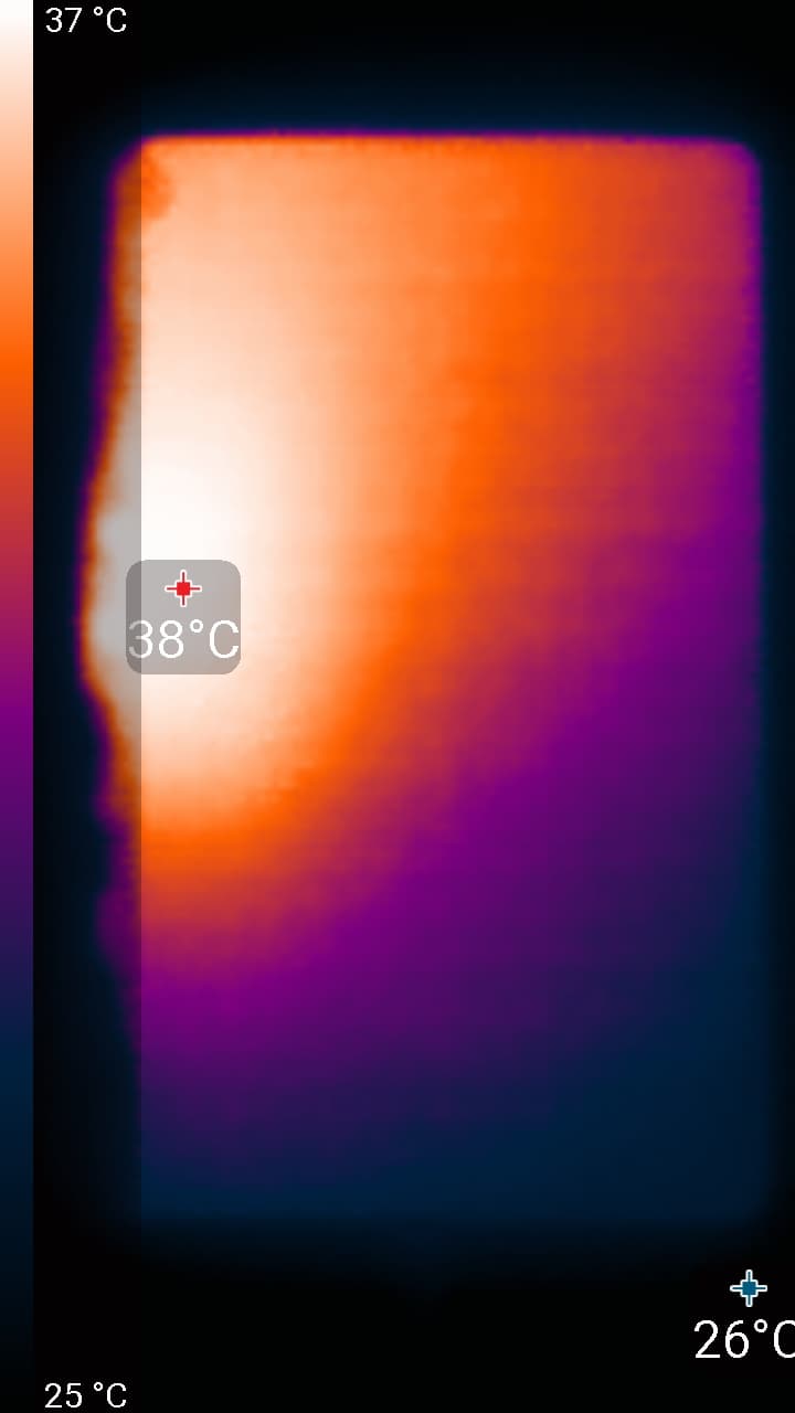 Нагрев выше в правой части аппарата, что, видимо, соответствует расположению микросхемы SoC. По данным теплокамеры, максимальный нагрев составил 38 градусов (при температуре окружающего воздуха в 24 градуса), это не очень много. Ровно столько же было и у Huawei MatePad 2022.