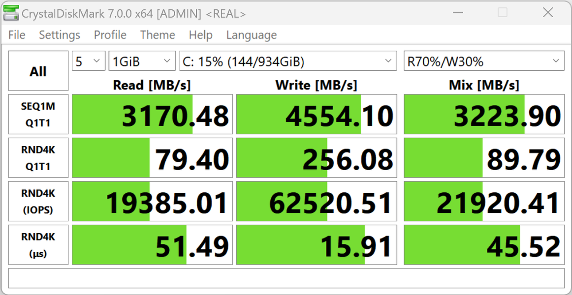 Значения весьма привлекательные, но даже близко не подходят к максимальному пределу скоростей, доступных при подключении по PCIe 4.0 ×4 (теоретический лимит 7000 МБ/с).
