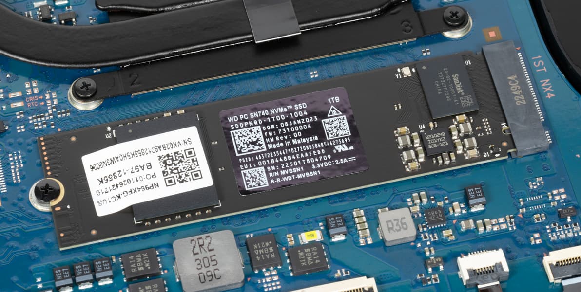 Ноутбук комплектуется твердотельным накопителем Western Digital PC SN740 емкостью 1 ТБ, установленным в слот M.2 2280 (интерфейс PCIe 4.0 ×4). На официальном сайте указаны его скорости последовательного чтения и записи — 5150 и 4900 МБ/с соответственно.