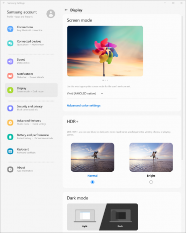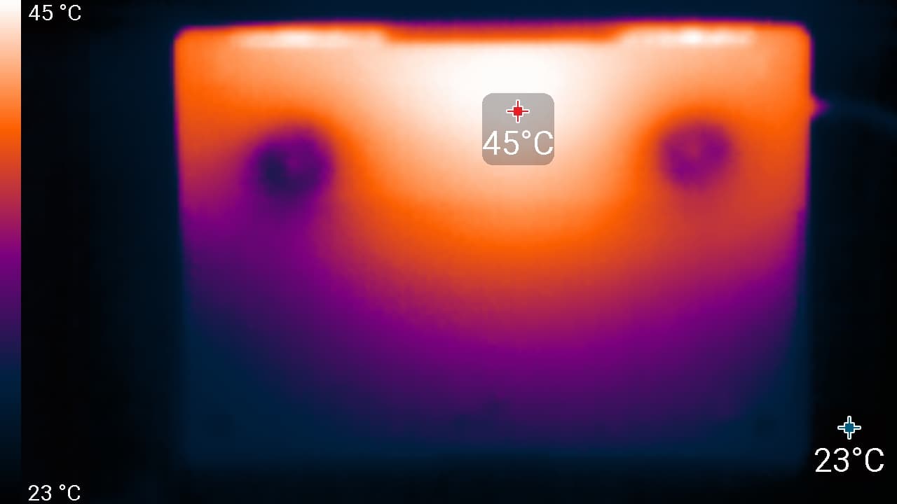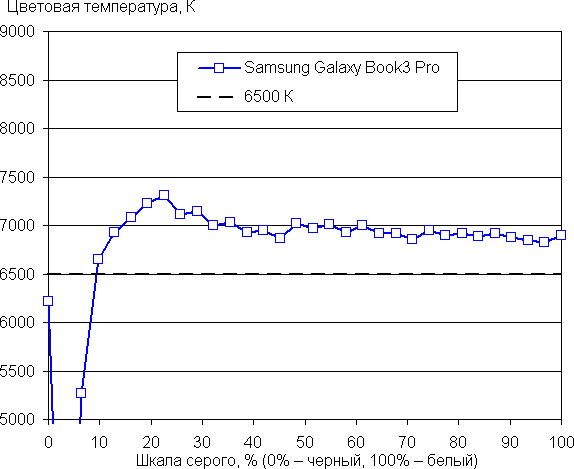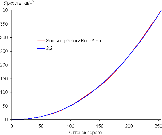 При питании от сети или от батареи и при ручном управлении яркостью ее максимальное значение в режиме SDR составило порядка 400 кд/м² (в центре экрана на белом фоне во весь экран). Максимальная яркость довольно высокая. Если избегать прямого солнечного света, то даже такое значение позволит с относительным комфортом использовать ноутбук на улице летним солнечным днем.
