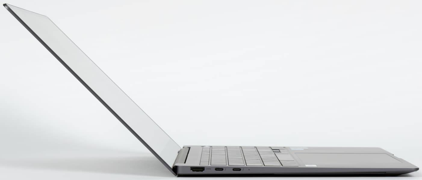 Отклонение крышки при раскрытии достигает 135°. Samsung Galaxy Book3 Pro обладает 16-дюймовым экраном и поэтому не столь большой, как 17-дюймовые модели, хотя с учетом размеров о собственно «notebook» (книге для заметок) говорить можно лишь с изрядной натяжкой. Соотношение сторон 16:10 вместо традиционных 16:9 увеличивает размер дисплея по вертикали и делает машину визуально более габаритной, но и обеспечивает более удобную работу с офисными приложениями. Вес 1,4 кг достаточно скромен по меркам «крупнопанельных» портативных машин.
