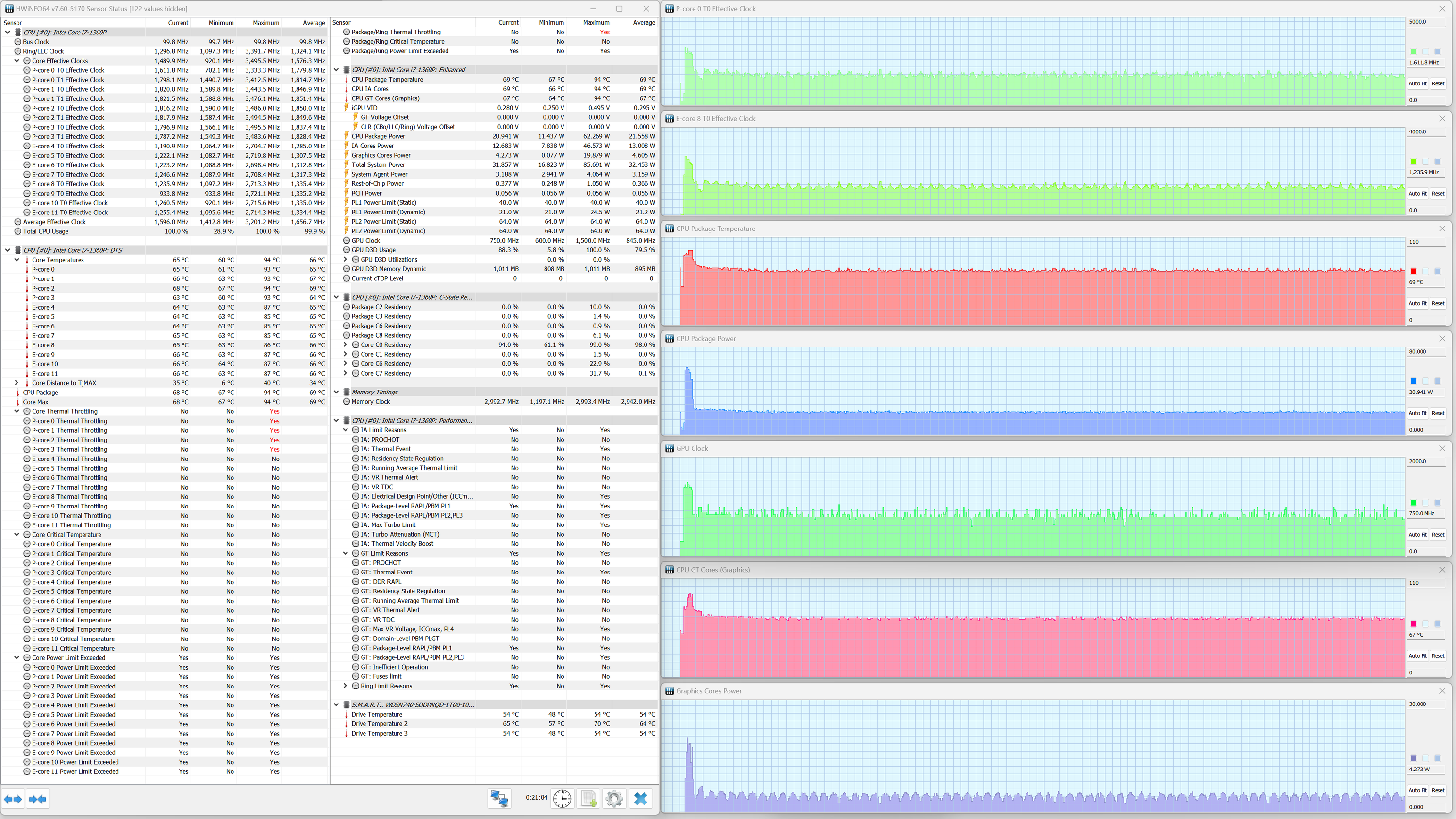 В ноутбуке Samsung Galaxy Book3 Pro установлен мобильный процессор Intel Core i7-1360P. В соответствии с термопакетом, его тепловыделение в стабильном режиме составляет до 28 Вт, а при разгоне — до 64 Вт. Энергоэффективные ядра (E) могут, согласно паспорту, разгоняться до 3,7 ГГц, а высокопроизводительные (P) — до 5 ГГц. Верхняя граница нагрева процессора составляет 100 °C. В ходе испытаний CPU отбирал в пике до 64 Вт, что чуть ниже паспортного значения, а при стабильной работе — до 34 Вт.
