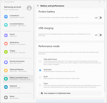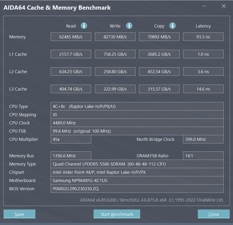 Машина располагает 32 ГБ оперативной памяти LPDDR5, микросхемы которой, как и процессор, распаяны на плате. Слотов для установки дополнительных модулей нет, что исключает возможность замены и апгрейда ОЗУ. Проведем ее проверку на быстродействие при помощи встроенного бенчмарка утилиты Aida64 в высокопроизводительном (High Performance) и оптимизированном (Optimized) режимах в соответствии с установками фирменной утилиты Samsung Settings.