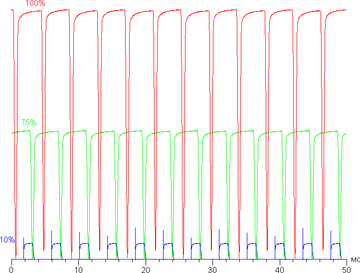 На любом уровне яркости присутствует значимая модуляция с частотой 240 Гц. На рисунке ниже приведены зависимости яркости (вертикальная ось) от времени (горизонтальная ось) для нескольких значений настройки яркости (зависимость реальной яркости от %% шкалы нелинейная):