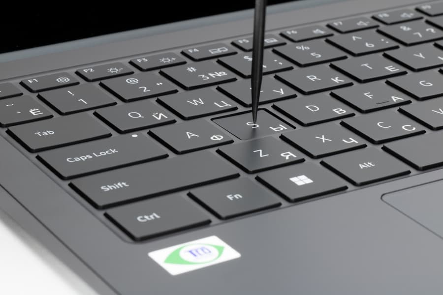 Перед клавиатурой помещается увеличенный по площади, чуть утопленный кликпад размером 140×90 мм без выделенных кнопок. Как подчеркивает производитель, его площадь на 24% больше, чем у 14-дюймового Galaxy Book3 Pro и на 39% больше, чем у равновеликого собрата Galaxy Book3 Pro прежнего поколения. Дальняя от пользователя часть сенсорной площадки на нажатия реагирует плохо, их лучше совершать в ближних ⅔, где четкость срабатывания хорошая. С жестами, подразумевающими касание поверхности, никаких проблем не возникает.