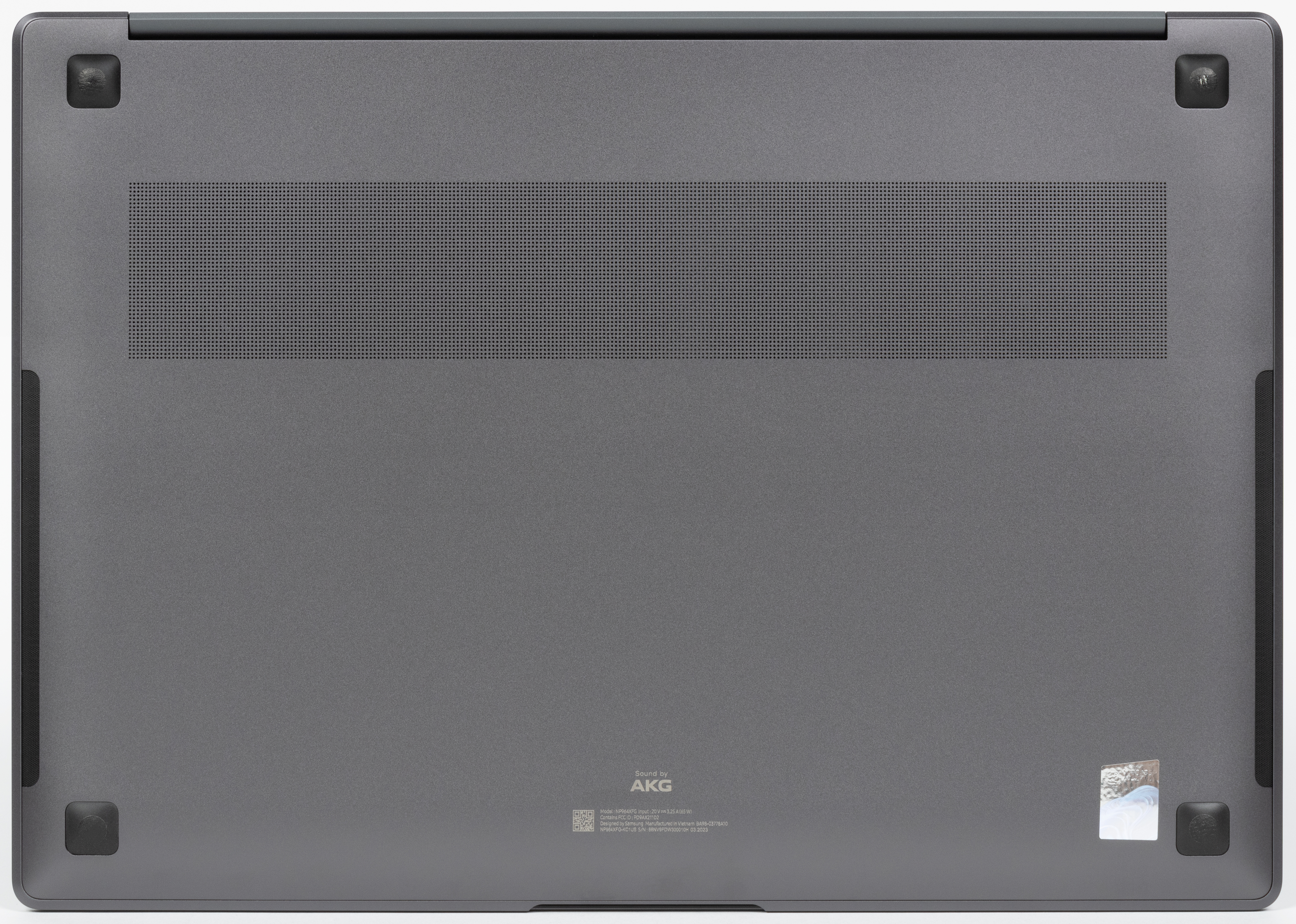 На днище нет ничего примечательного кроме передних и задних опор, небольшой по площади вентиляционной решетки со щелями для забора воздуха системой охлаждения и боковых накладок под динамиками.