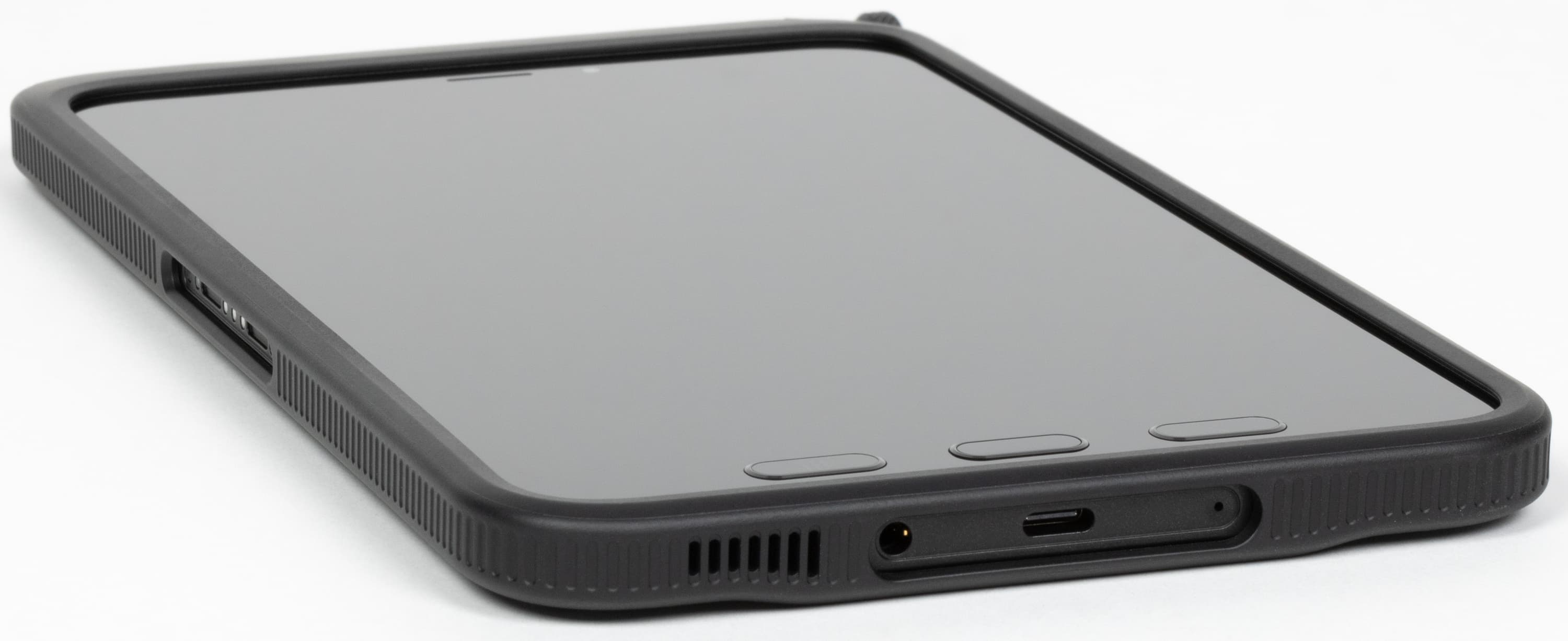 Три другие кнопки расположены не на боковой поверхности, а под экраном (если держать планшет в портретной ориентации). Это стандартные навигационные кнопки Android (список запущенных приложений, главный экран, назад), от которых мы уже почти отвыкли, поскольку их заменили экранные жесты (а ранее — экранные же кнопки). Дело в том, что сценарии использования этого планшета предполагают в том числе работу в перчатках, а доставать каждый раз стилус, чтобы вернуться на шаг назад, немного утомительно. Кнопки тактильно одинаковы, но мышечная память быстро восстанавливается, поэтому проблем у старых пользователей Android возникнуть не должно.