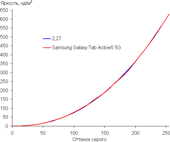 Построенная по 32 точкам с равным интервалом по численному значению оттенка серого гамма-кривая не выявила завала ни в светах, ни в тенях. Показатель аппроксимирующей степенной функции равен 2,27, что чуть выше стандартного значения 2,2. При этом реальная гамма-кривая мало отклоняется от степенной зависимости: