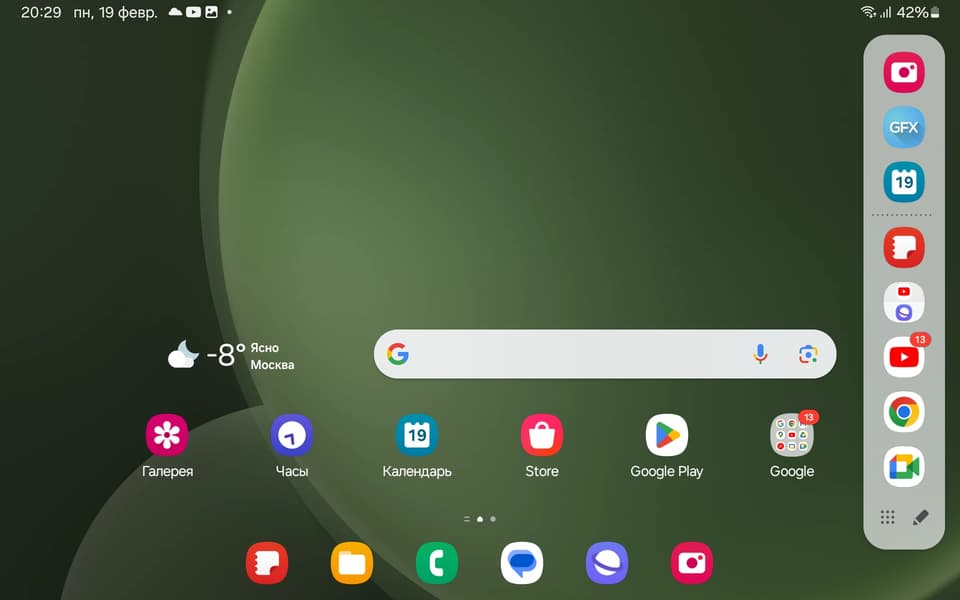 Далее, от правого края экрана (при ландшафтной ориентации планшета) вытягивается еще одна панель, где по умолчанию расположены иконки различных приложений, которые вы можете заменить на другие или вывести туда какие-то виджеты. Этих панелей может быть несколько, между ними можно переключаться свайпами.