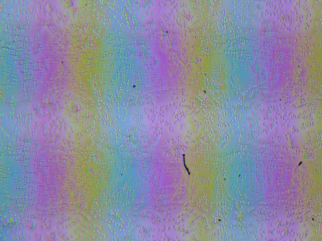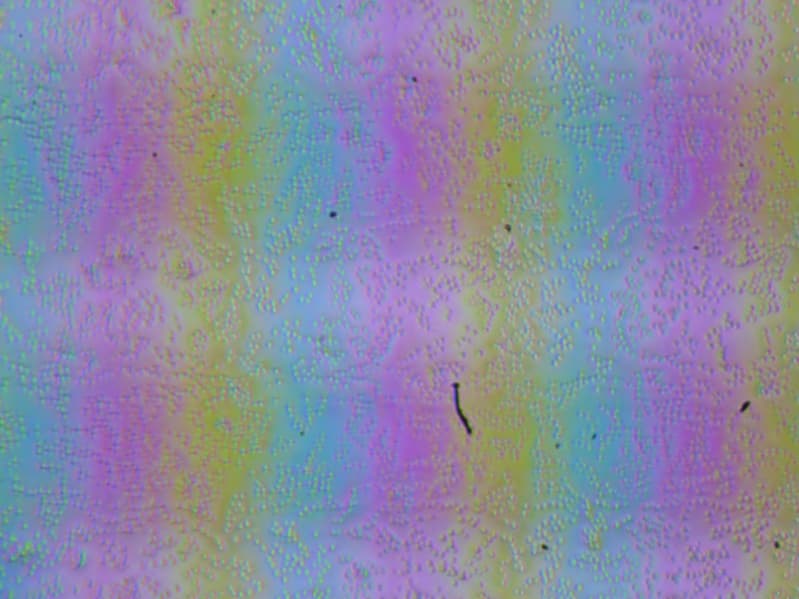 Зерно этих дефектов в несколько раз меньше размеров субпикселей (масштаб этих двух фотографий примерно одинаковый), поэтому фокусировка на микродефектах и «перескок» фокуса по субпикселям при изменении угла зрения выражены слабо, из-за этого нет и «кристаллического» эффекта, но некоторая вариация яркости и оттенка в масштабе пикселей все же наблюдается.