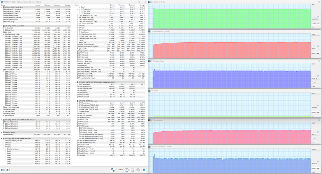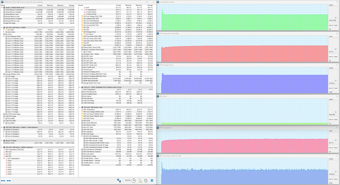 При максимальной нагрузке на оба вычислителя начальный разгон сопровождается ростом потребления процессора до тех же 38 Вт, что и ранее, но отдача по тактовой частоте и температура оказывается меньше (2,5 ГГц и 62 °C). Ни перегрева, ни тротлинга нет. Видеоускоритель демонстрирует бросок отбора мощности до 42 Вт, но это не сопровождается ростом тактовой частоты. Спустя пару секунд потребление GPU снижается до 27 Вт, а отдача по тактовой частоте и температура остаются до конца тестового прогона на неизменных уровнях — 0,4 ГГц и 60 °C.