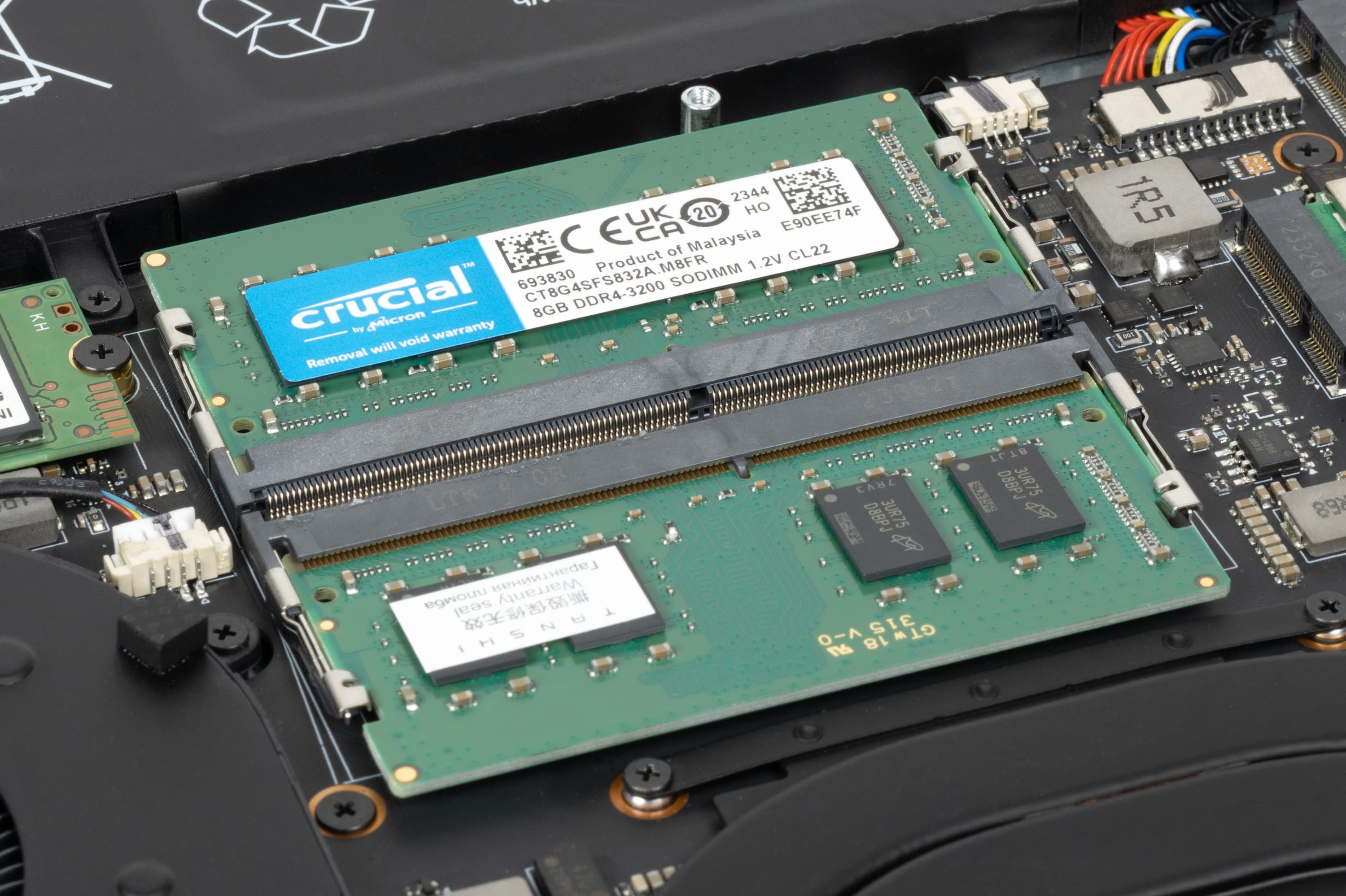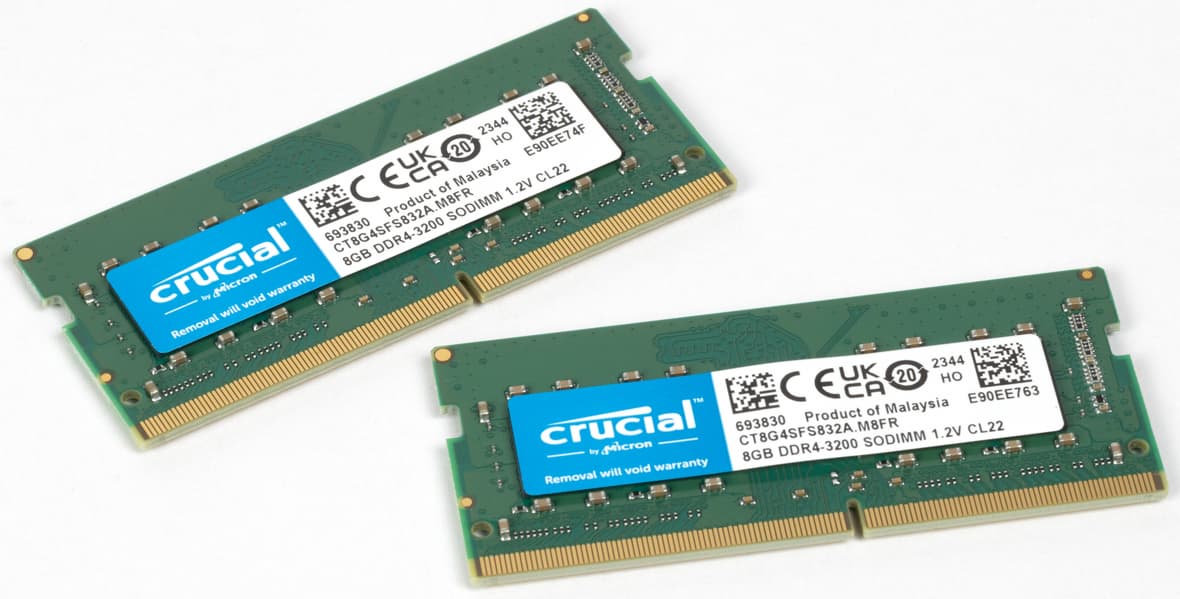 С завода ноутбук приезжает с двумя 8-гигабайтными модулями DDR4-3200 Crucial/Micron CT8G4SFS832A. По нынешним меркам ОЗУ не слишком расторопное. Можно изменить наполнение слотов памяти, доведя ее максимальный объем до 64 ГБ.