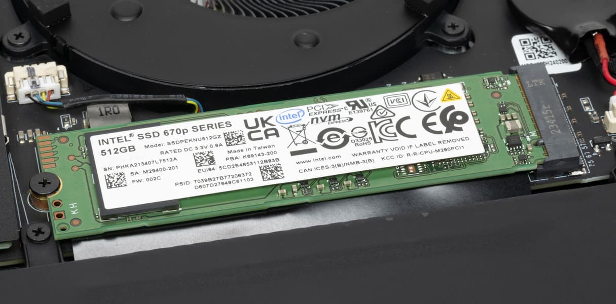 На системной плате имеется слот для установки NVMe-накопителя, и он занят системным хранилищем Intel 670p Series SSDPEKNU512GZ с интерфейсом подключения PCIe 3.0 ×4. Неформатированная емкость этого устройства составляет 512 ГБ — это скромно, но при стандартной практике должно хватить.