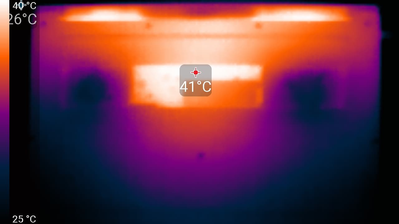 Под максимальной нагрузкой работать с клавиатурой комфортно, так как места под запястьями не нагреваются. Держать ноутбук на коленях при этом также комфортно, так как колени нагрев едва чувствуют. Впрочем, колени могут перекрыть заборные вентиляционные решетки (чего не происходит при размещении ноутбука на ровной твердой поверхности), что может вызвать перегрев ноутбука. Блок питания греется не сильно, но все равно при долговременной работе с большой производительностью нужно следить, чтобы он не был чем-то накрыт.