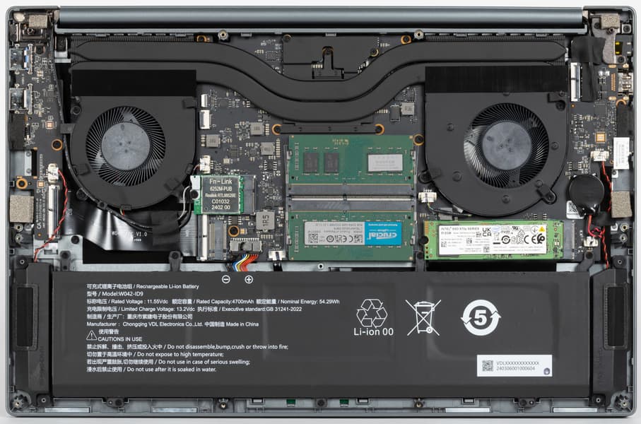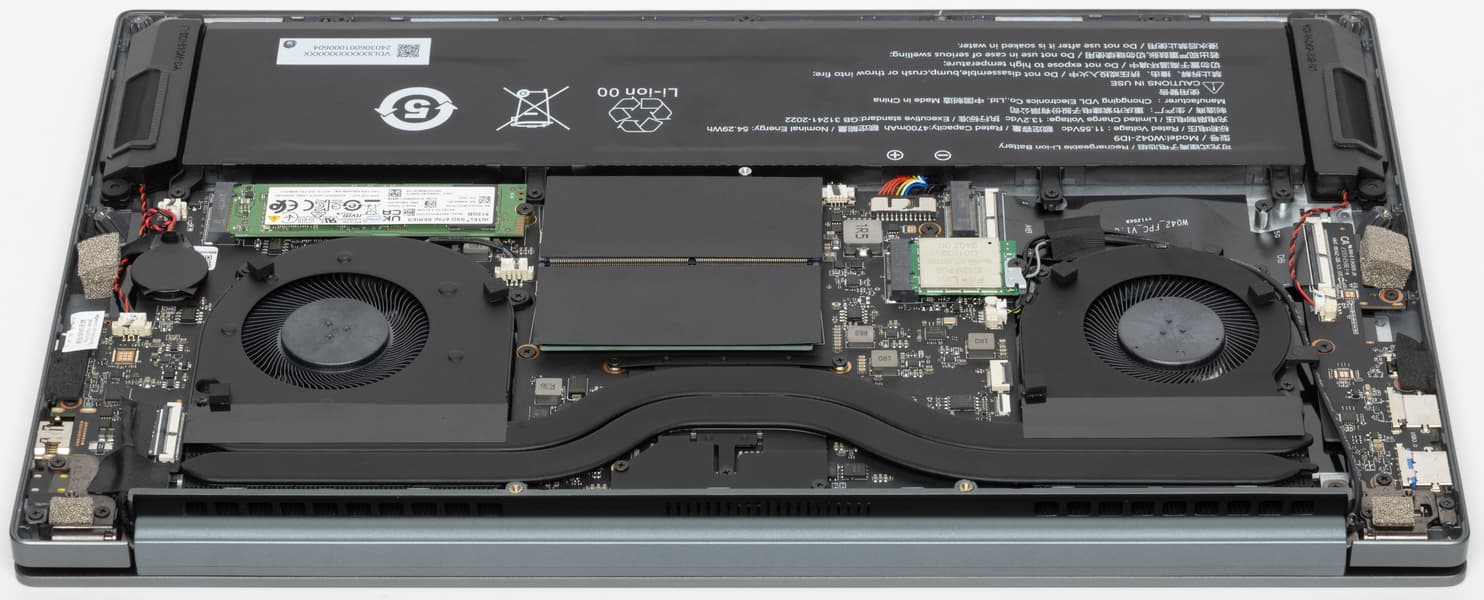 Во внутреннем объеме Tanshi M15C доминируют система охлаждения, аккумулятор и системная плата с правым сателлитом (на фото — слева), который подключен при помощи широкого черного шлейфа.