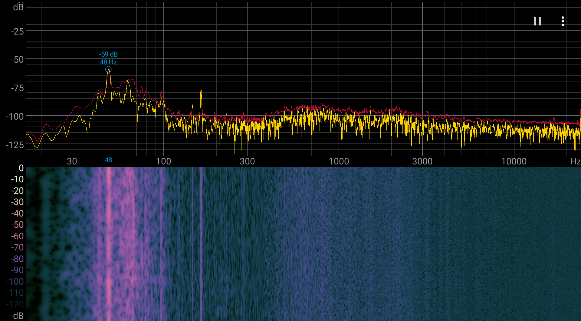 Если ноутбук не нагружать совсем, то его система охлаждения в указанных выше условиях не может долговременно работать в пассивном режиме. Впрочем, в этом случае шум от системы охлаждения очень и очень низкий. Даже под максимальной нагрузкой шум невысокой, а его характер ровный и раздражения не вызывает. Спектрограмма, полученная для этого случая, достаточно ровная и в диапазоне частот, где звуки могут вызывать особенное раздражение, выраженных пиков нет: