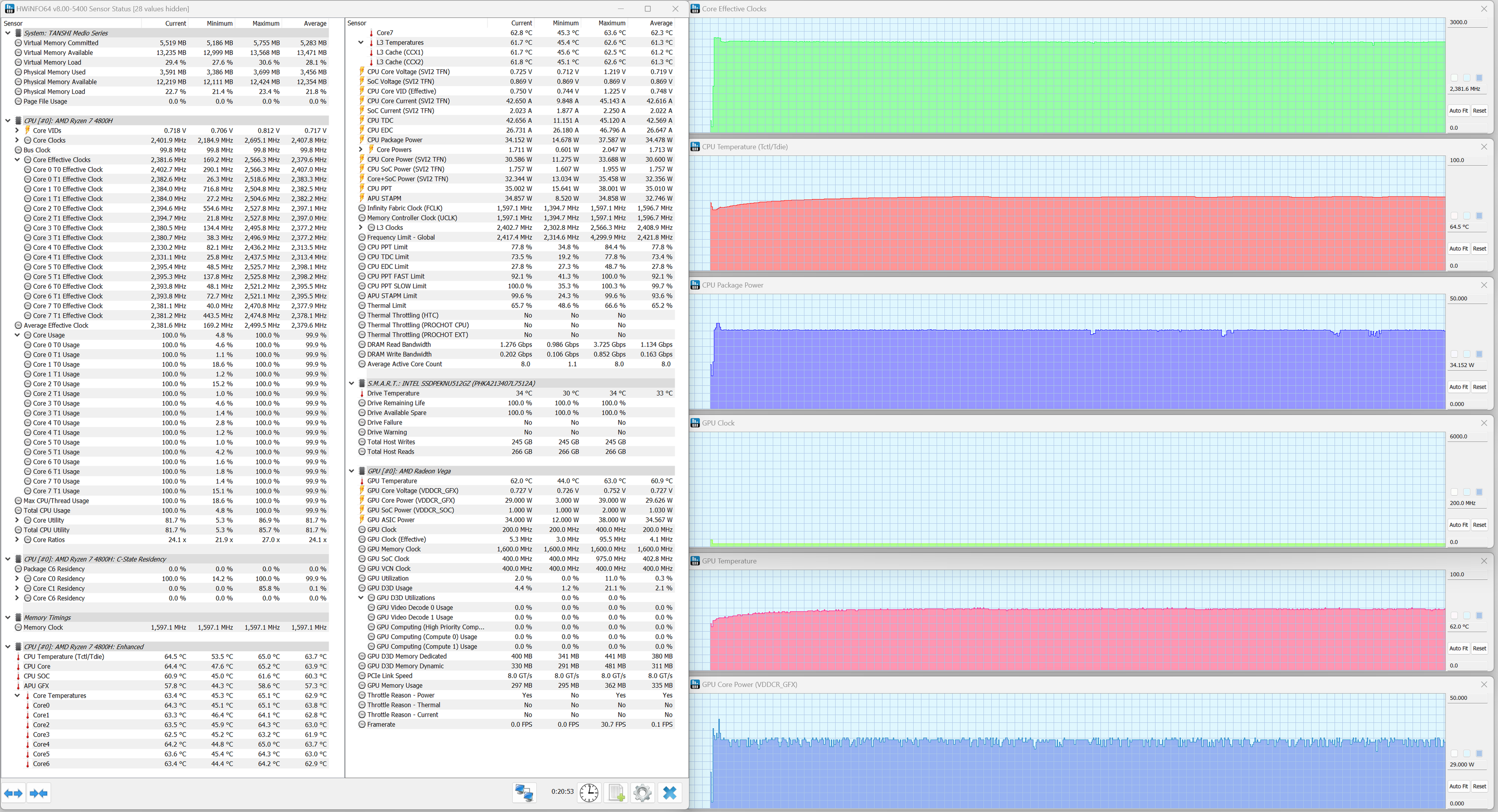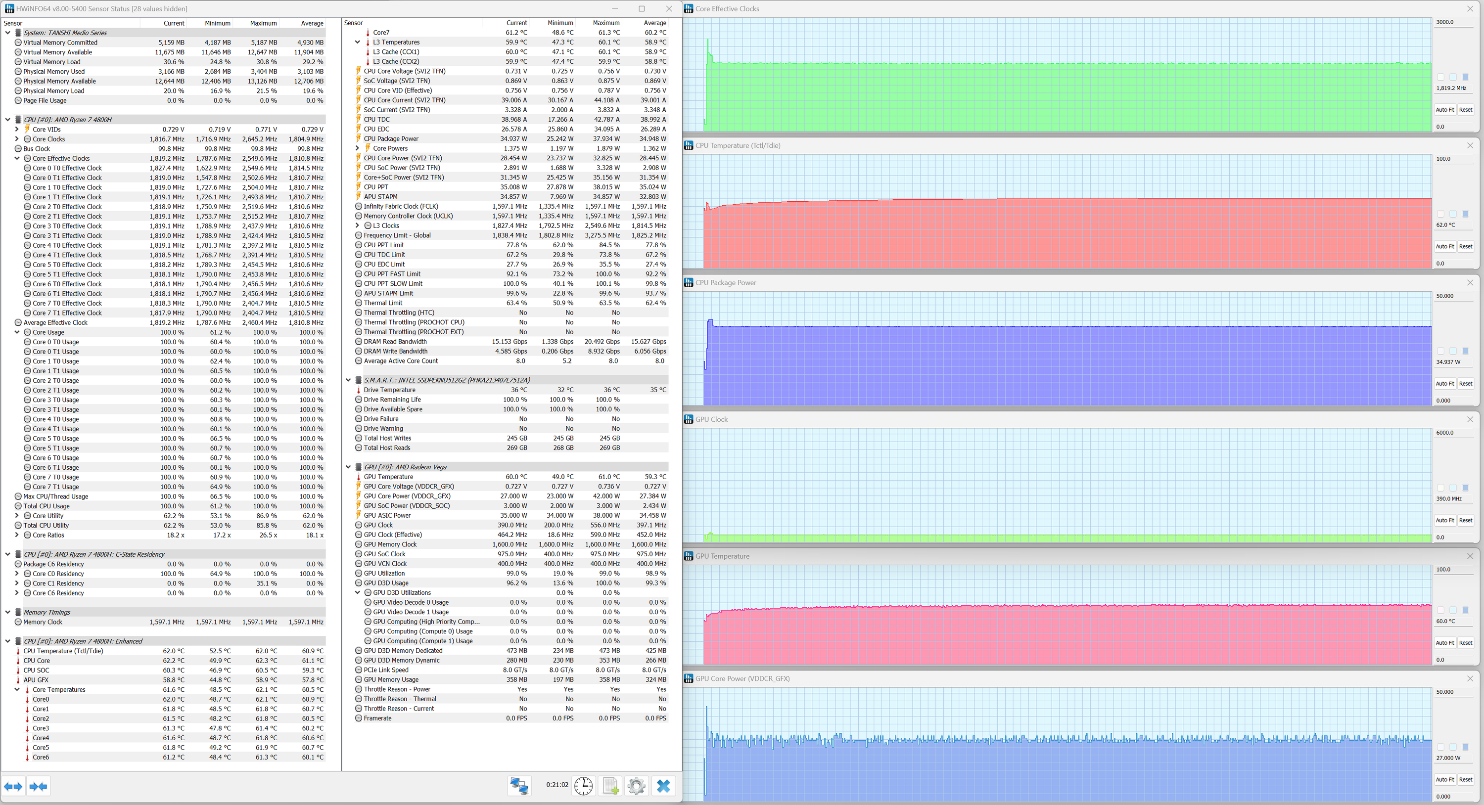 Tanshi M15C оснащен мобильным процессором AMD Ryzen 7 4800H поколения Renoir-H (ядра Zen 2). Это довольно старое решение (анонс в январе 2020 г.) и явно не топовое. В составе чипа 8 двухпотоковых ядер (всего 16 потоков), тактовая частота составляет 2,9 в стабильном режиме и 4,2 ГГц при разгоне. Теплопакет 45 Вт, Tmax 105 °C. В тестах под нагрузкой мы видели, что процессор отбирал при разгоне 38 Вт мощности, что несколько ниже предписаний термопакета, а в стабильном режиме потребление составило 35 Вт. Тактовая частота не превышала 2,5 ГГц.