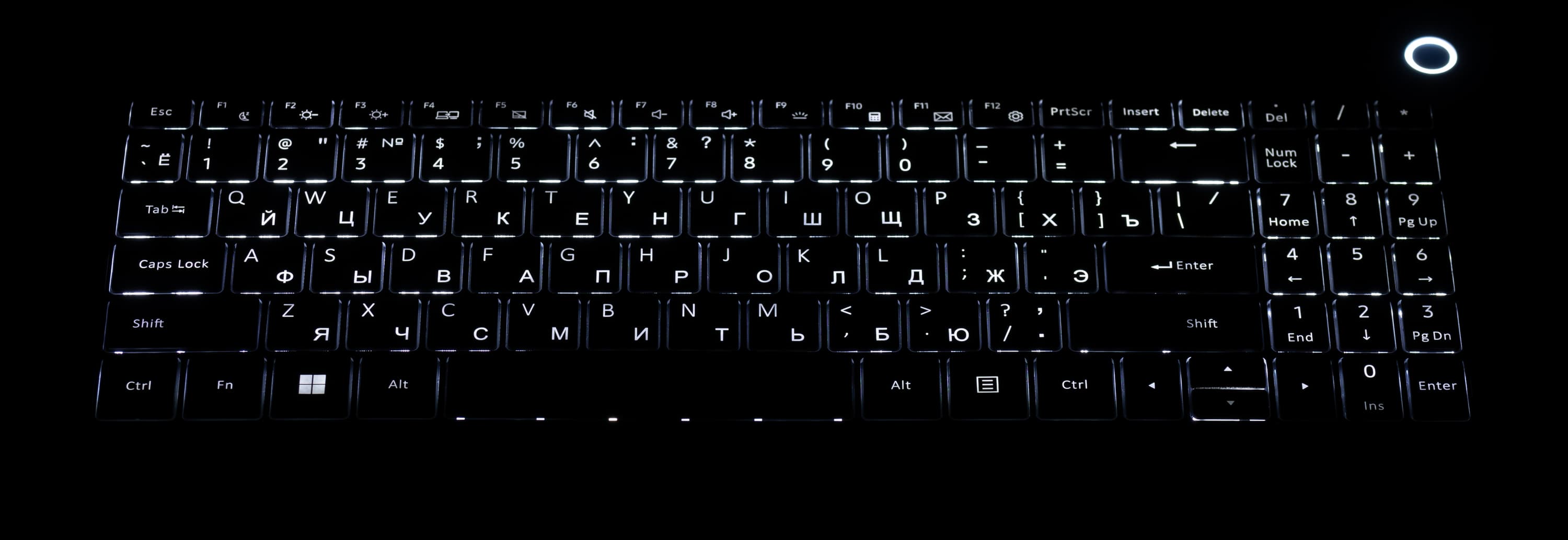 Клавиатура снабжена однотонной белой подсветкой с тремя уровнями по яркости. Переключение производится повторным нажатием аккорда Fn+F9. Символы латинского алфавита и кириллицы подсвечиваются одинаково хорошо и без труда различимы.
