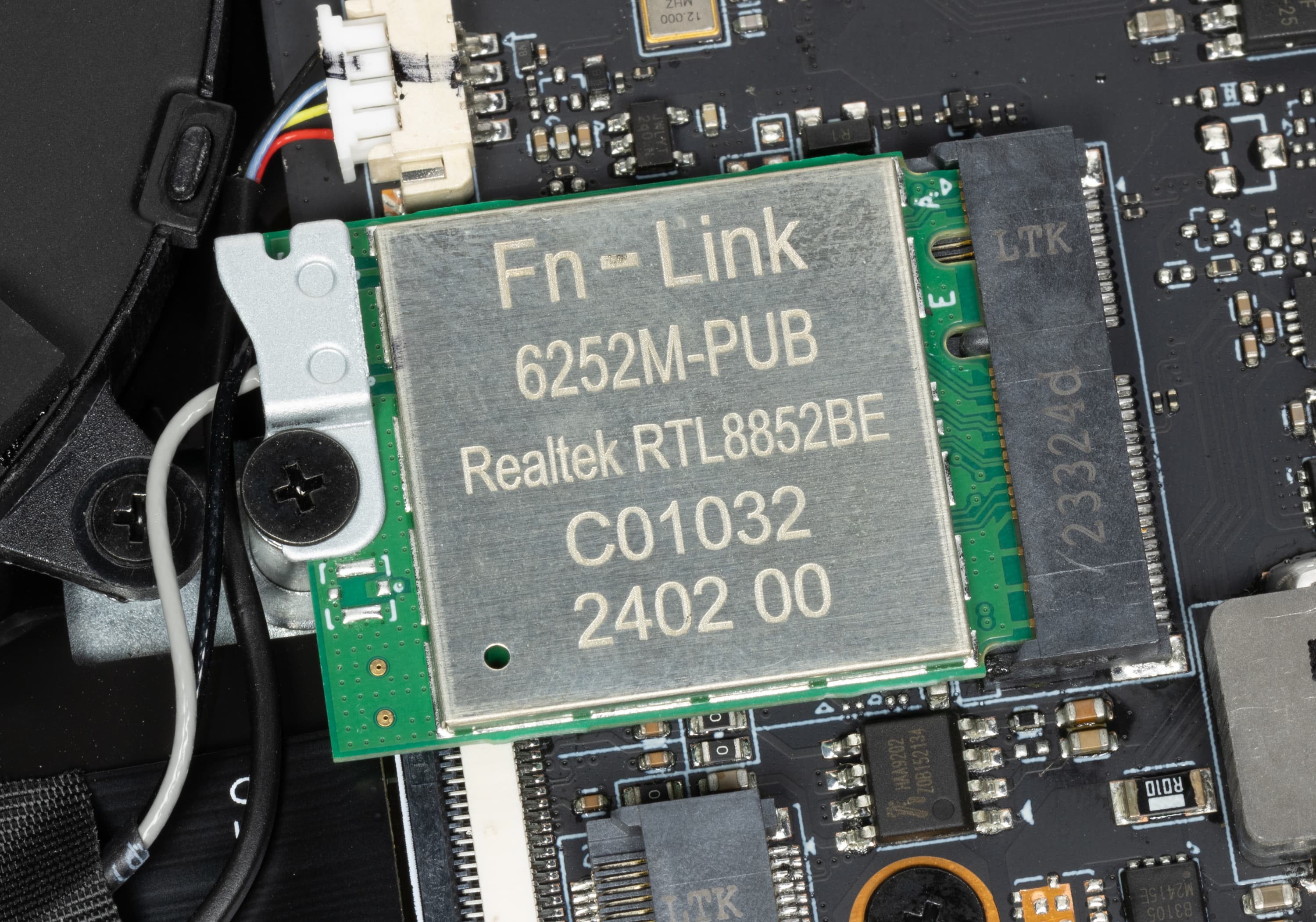 Беспроводную связь обеспечивает двухдиапазонный (2,4/5 ГГц) адаптер Fn-Link 6252M-PUB, соответствующий классу Wi-Fi 6, с поддержкой стандартов 802.11ax. Он обладает двумя антеннами, работающими одновременно на прием и передачу (2T2R).