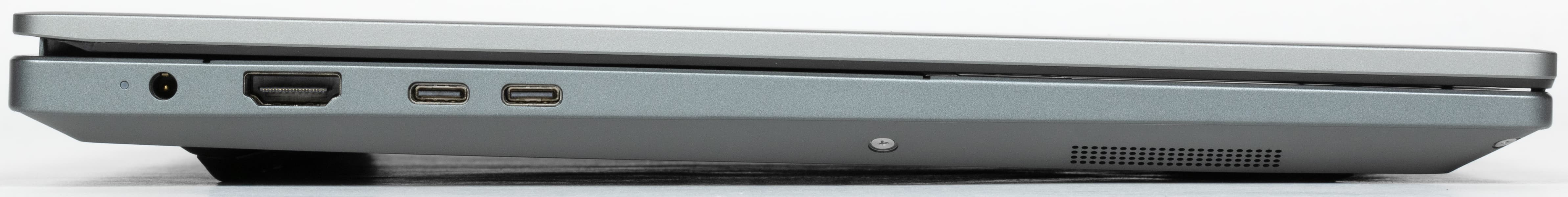 На левой боковой панели помещаются коаксиальный разъем для подключения адаптера питания, видеовыход HDMI, порты USB 3.1 Gen1 Type-C и USB 2.0 Type-C.