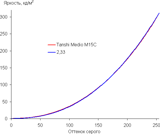 Аппроксимация полученной гамма-кривой дала показатель 2,33, что немного выше стандартного значения 2,2, поэтому картинка чуть затемнена. При этом реальная гамма-кривая мало отклоняется от аппроксимирующей степенной функции: