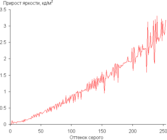 Далее мы измерили яркость 256 оттенков серого (от 0, 0, 0 до 255, 255, 255). График ниже показывает прирост (не абсолютное значение!) яркости между соседними полутонами: