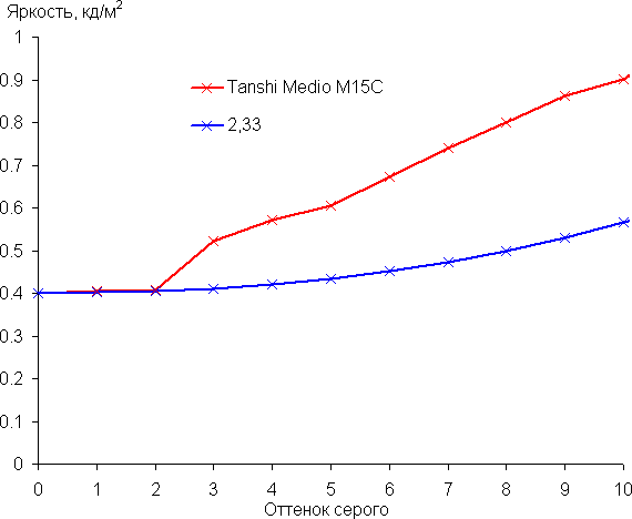 Рост прироста яркости на шкале серого в основном равномерный, и почти каждый следующий оттенок ярче предыдущего, за исключением пары ближайших к черному оттенков, которые по яркости от него практически не отличаются. Впрочем, общей картины это не портит: