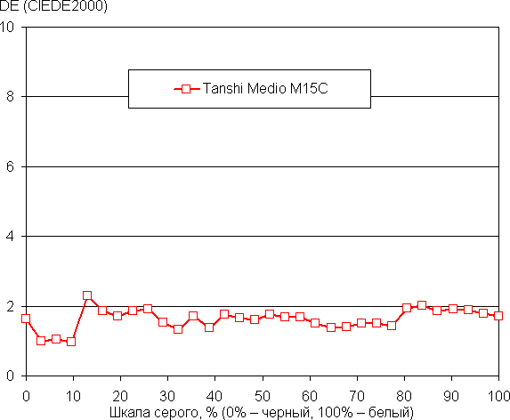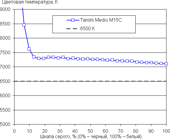 Баланс оттенков на шкале серого хороший, так как цветовая температура не сильно выше стандартных 6500 К и отклонение от спектра абсолютно черного тела (ΔE) ниже 3, что даже для профессионального устройства считается отличным показателем. При этом цветовая температура и ΔE мало изменяются от оттенка к оттенку — это положительно сказывается на визуальной оценке цветового баланса. (Самые темные области шкалы серого можно не учитывать, так как там баланс цветов не имеет большого значения, да и погрешность измерений цветовых характеристик на низкой яркости большая.)