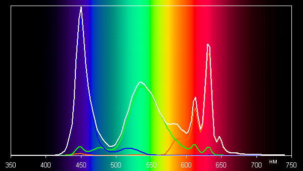 Поэтому визуально цвета изображений, ориентированных на вывод в пространстве sRGB, на этом экране имеют естественную насыщенность. Ниже приведен спектр для белого поля (белая линия), наложенный на спектры красного, зеленого и синего полей (линии соответствующих цветов):