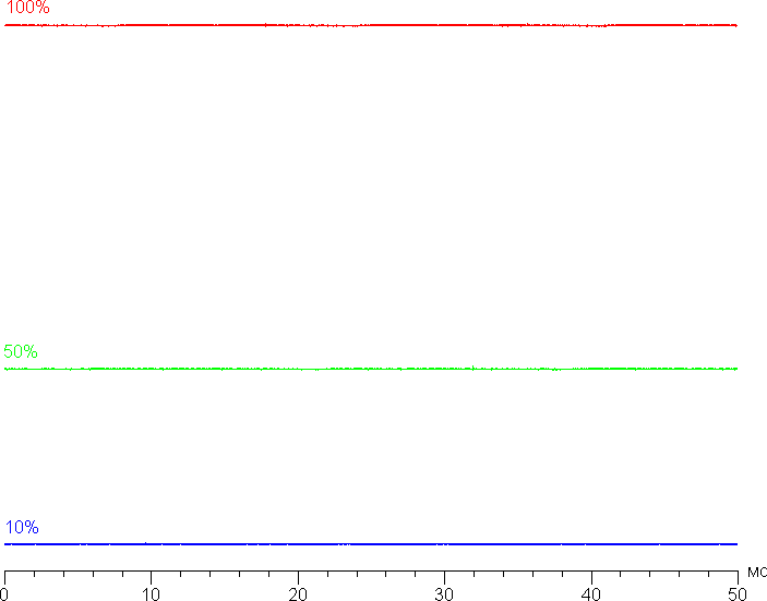 На любом уровне яркости значимая модуляция подсветки отсутствует, поэтому нет и никакого мерцания экрана (нет ШИМ). В доказательство приведем графики зависимости яркости (вертикальная ось) от времени (горизонтальная ось) при различных значениях настройки яркости: