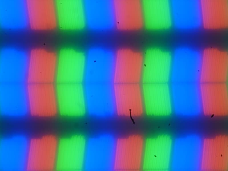 В этом ноутбуке используется матрица типа IPS. Микрофотографии демонстрируют типичную для IPS структуру субпикселей (черные точки — это пыль на матрице фотоаппарата):