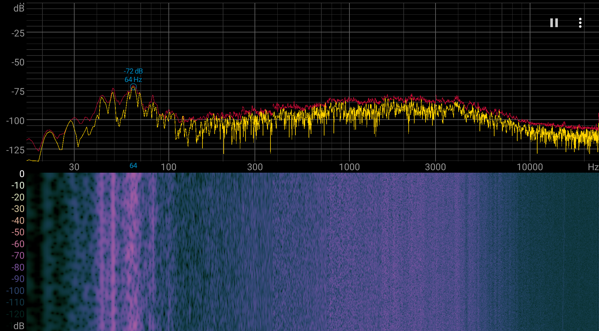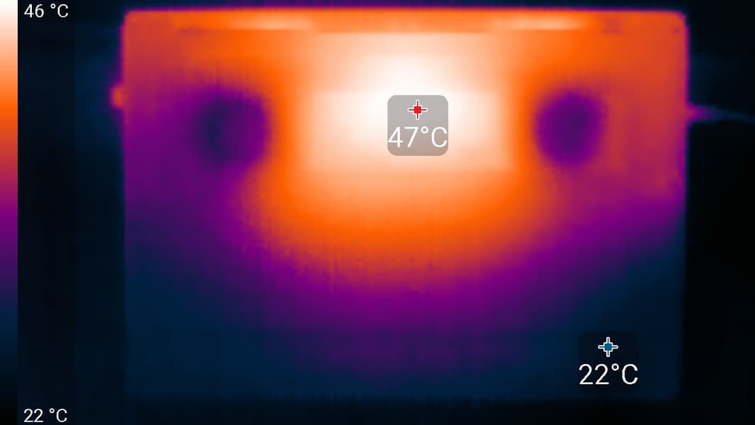 Если ноутбук не нагружать совсем, то его система охлаждения все равно не может долго работать в пассивном режиме, однако шум при этом очень и очень низкий, и, например, в условиях офиса ноутбук вовсе не будет слышно. Характер шума даже под высокой нагрузкой ровный и раздражения не вызывает. Спектрограмма, полученная для максимальной скорости вентиляторов, достаточно ровная, и в диапазоне частот, где звуки могут вызывать особенное раздражение, выраженных пиков нет: