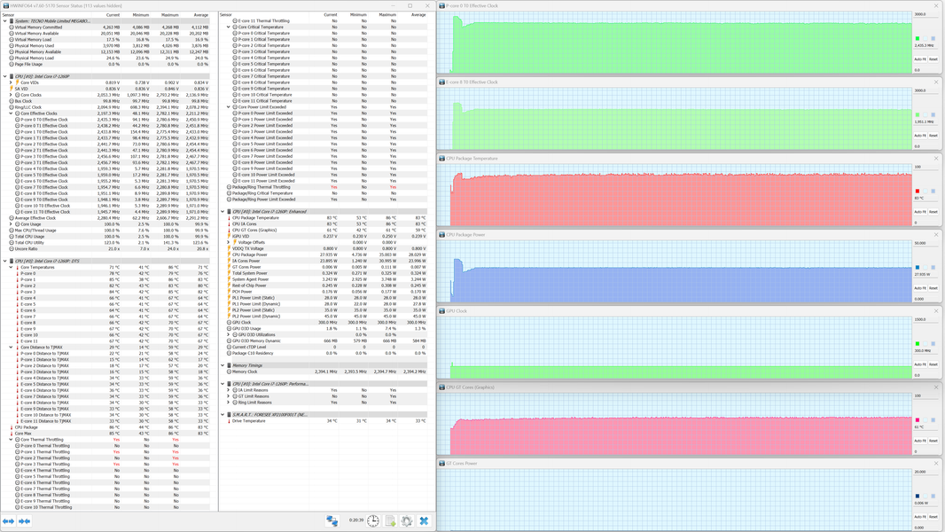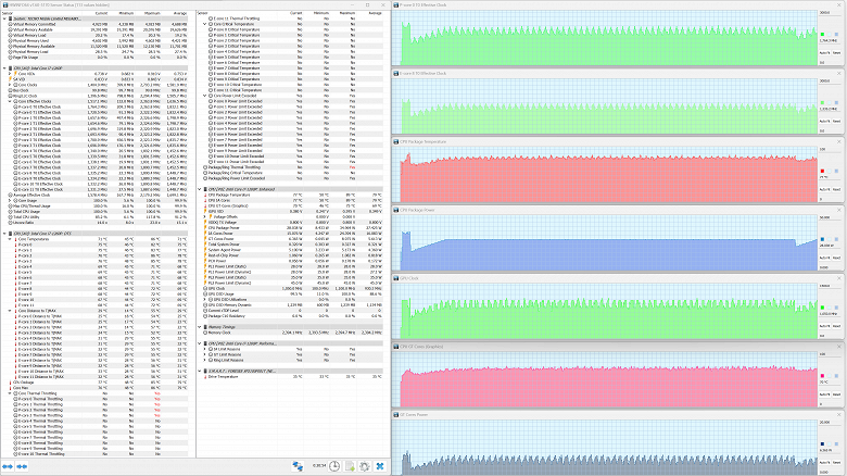 В ноутбуке Tecno Megabook S1 установлен мобильный процессор Intel Core i7-1260P. В соответствии с термопакетом, его тепловыделение в стабильном режиме составляет до 28 Вт, а при разгоне — до 64 Вт. E-ядра могут, согласно паспорту, разгоняться до 3,4 ГГц, а P-ядра — до 4,7 ГГц. Верхняя граница нагрева процессора составляет 100 °C. В ходе испытаний под максимальной нагрузкой CPU отбирал в турборежиме до 35 Вт, что значительно ниже паспортного максимума, а при стабильной работе отбирал мощность в точном соответствии паспортным значениям (28 Вт). Тактовая частота составила в пике 2,8 ГГц у P-ядер и 2,3 ГГц у E-ядер.