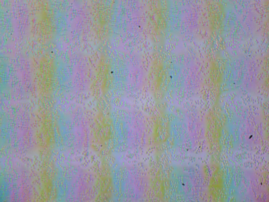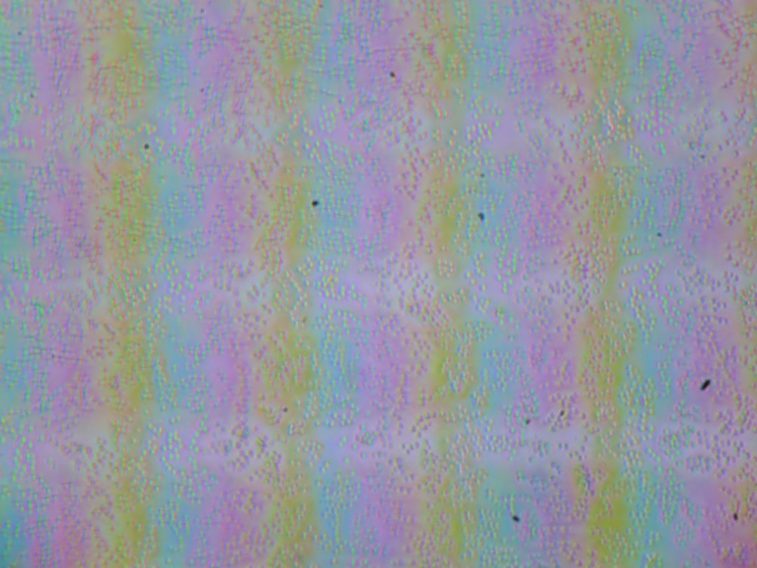 Зерно этих дефектов в несколько раз меньше размеров субпикселей (масштаб этих двух фотографий примерно одинаковый), поэтому фокусировка на микродефектах и «перескок» фокуса по субпикселям при изменении угла зрения выражены слабо, из-за этого нет и «кристаллического» эффекта, но некоторая вариация яркости и оттенка в масштабе пикселей все же наблюдается.