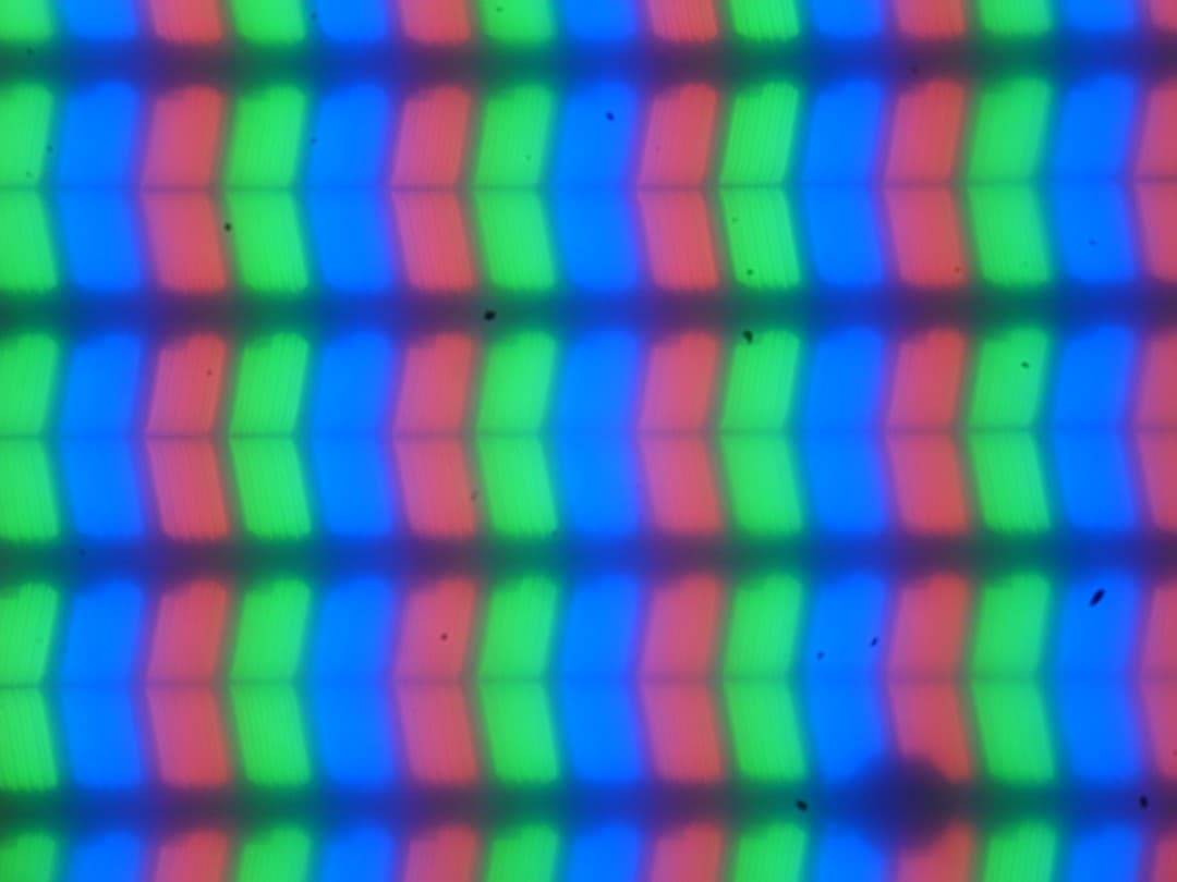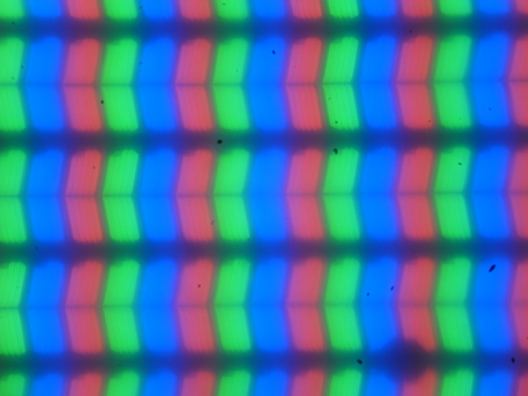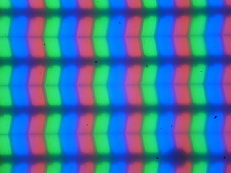 В этом ноутбуке используется матрица типа IPS. Микрофотографии демонстрируют типичную для IPS структуру субпикселей (черные точки — это пыль на матрице фотоаппарата):