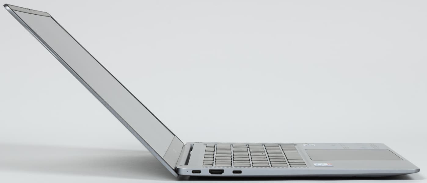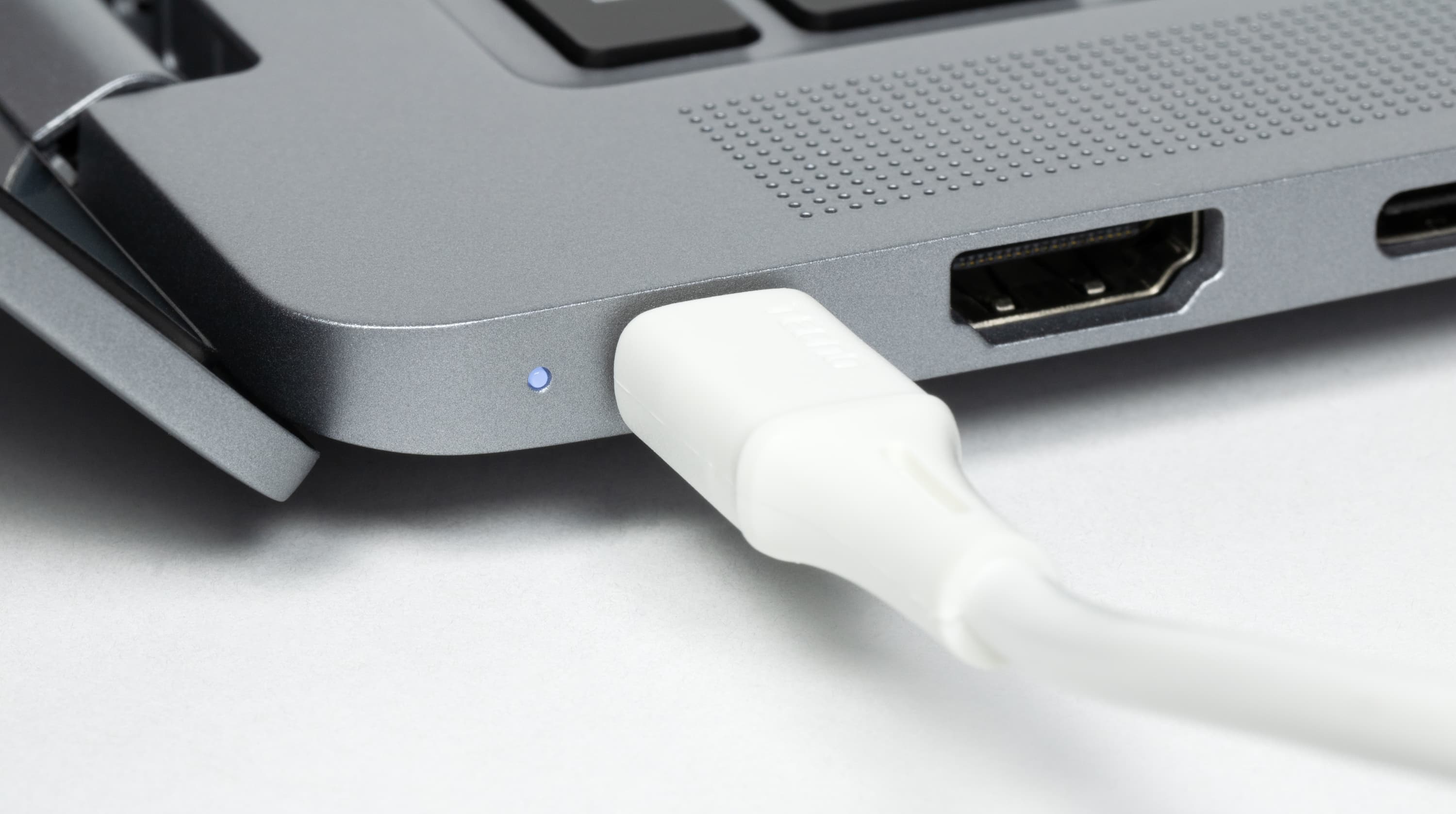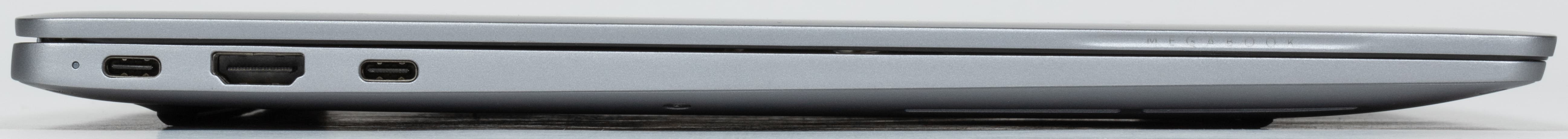 Слева помещаются два разъема USB Type-C, между которыми находится видеовыход HDMI. Дальний порт соответствует по спецификациям USB 4, а ближний — USB 3.1. Оба поддерживают вывод видео посредством DisplayPort, оба можно использовать для зарядки. О подключении адаптера питания уведомляет светодиодный индикатор, расположенный у дальнего разъема.