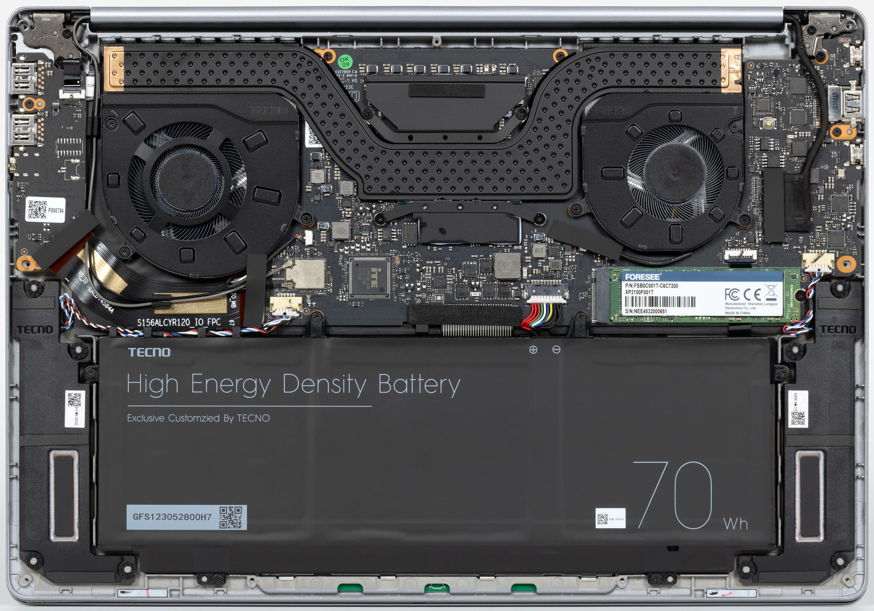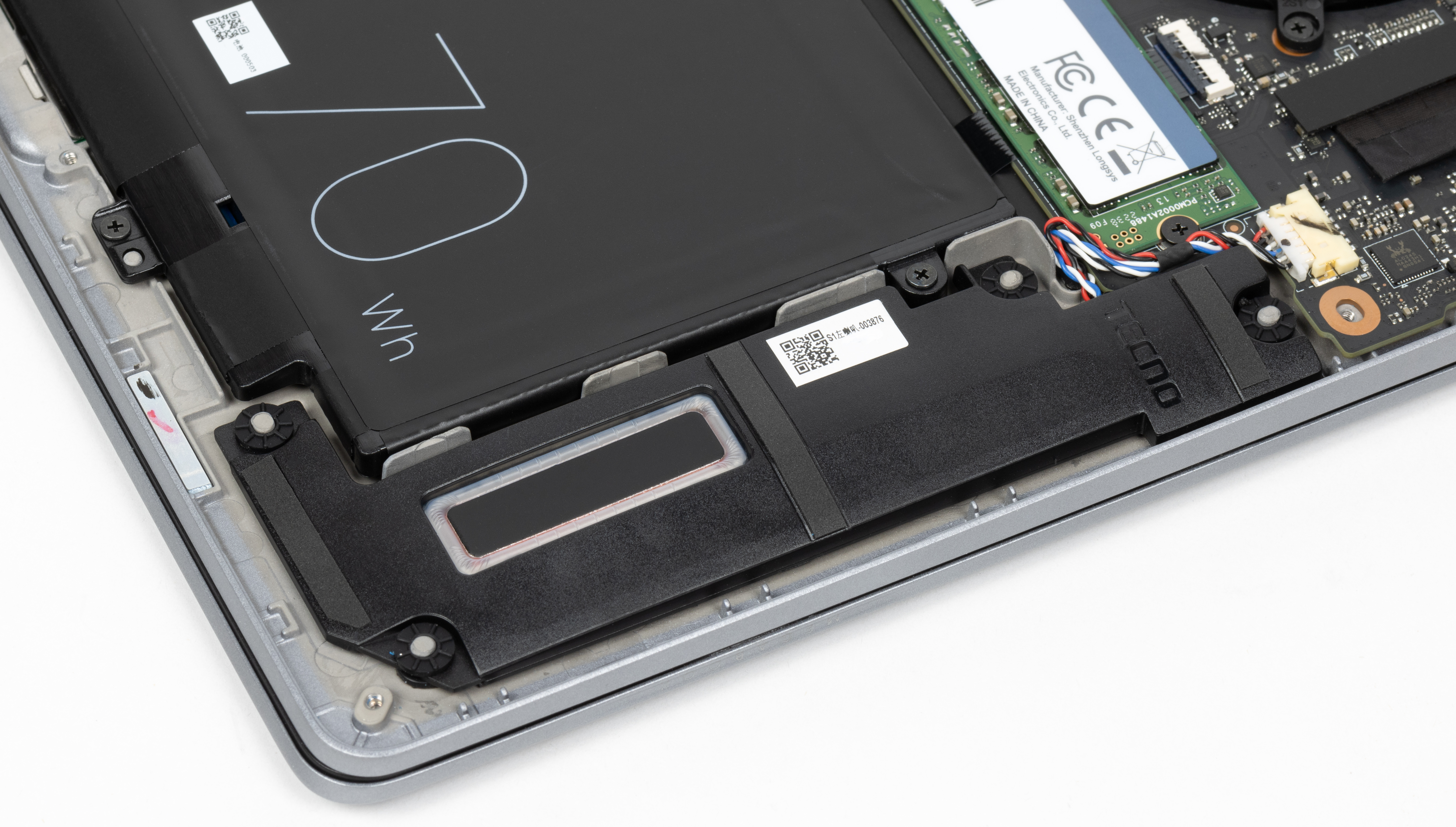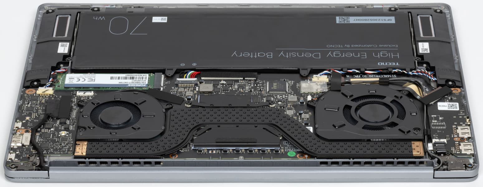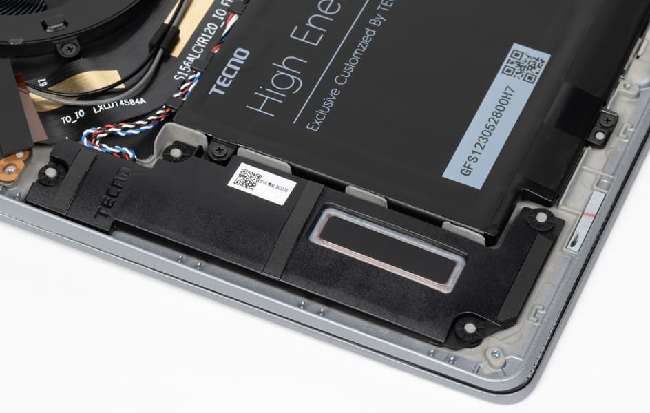 Внутри у Tecno Megabook S1 довольно тесно. Наибольший объем занимают система охлаждения, аккумулятор и суппорты динамиков. Системная плата разрезная, двухкомпонентная. Помимо основной части, содержащей все главные элементы схемотехники, имеется правый сателлит (на фото он расположен слева) с портами USB и картоводом. это позволяет в известной степени адаптировать расположение портов на боковых панелях при изменении ширины корпуса (например, для установки более крупного экрана). По меркам китайского производства сборка выполнена неплохо, но обойтись без образующей петли проводов, ведущих от системной платы к акустике, и их заклейки липкой лентой не удалось. Учитывая то обстоятельство, что большинство компонентов распаяно на системной плате (процессор, оперативная память, беспроводной адаптер), а свободные слоты M.2 отсутствуют, замене подлежат лишь аккумулятор и системный накопитель. Другими ресурсами аппаратной модернизации ноутбук не располагает.